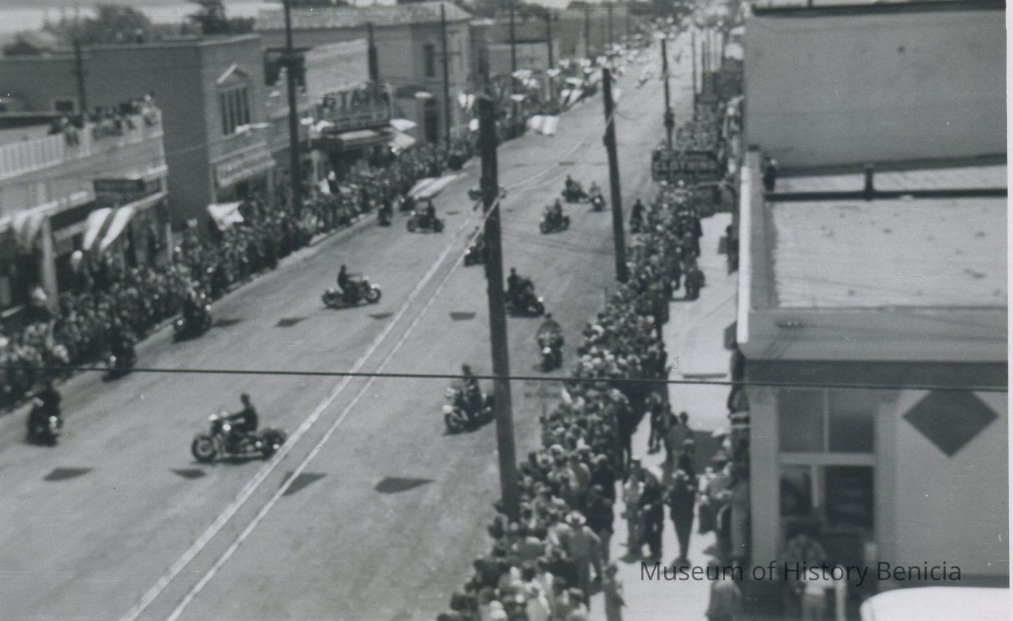 B/W Photograph - Parade on First Street; a view of the parade (time period unknown) from a roof top at the NW corner of the intersection of First and H Streets; a motorcycle drill team is performing a routine.