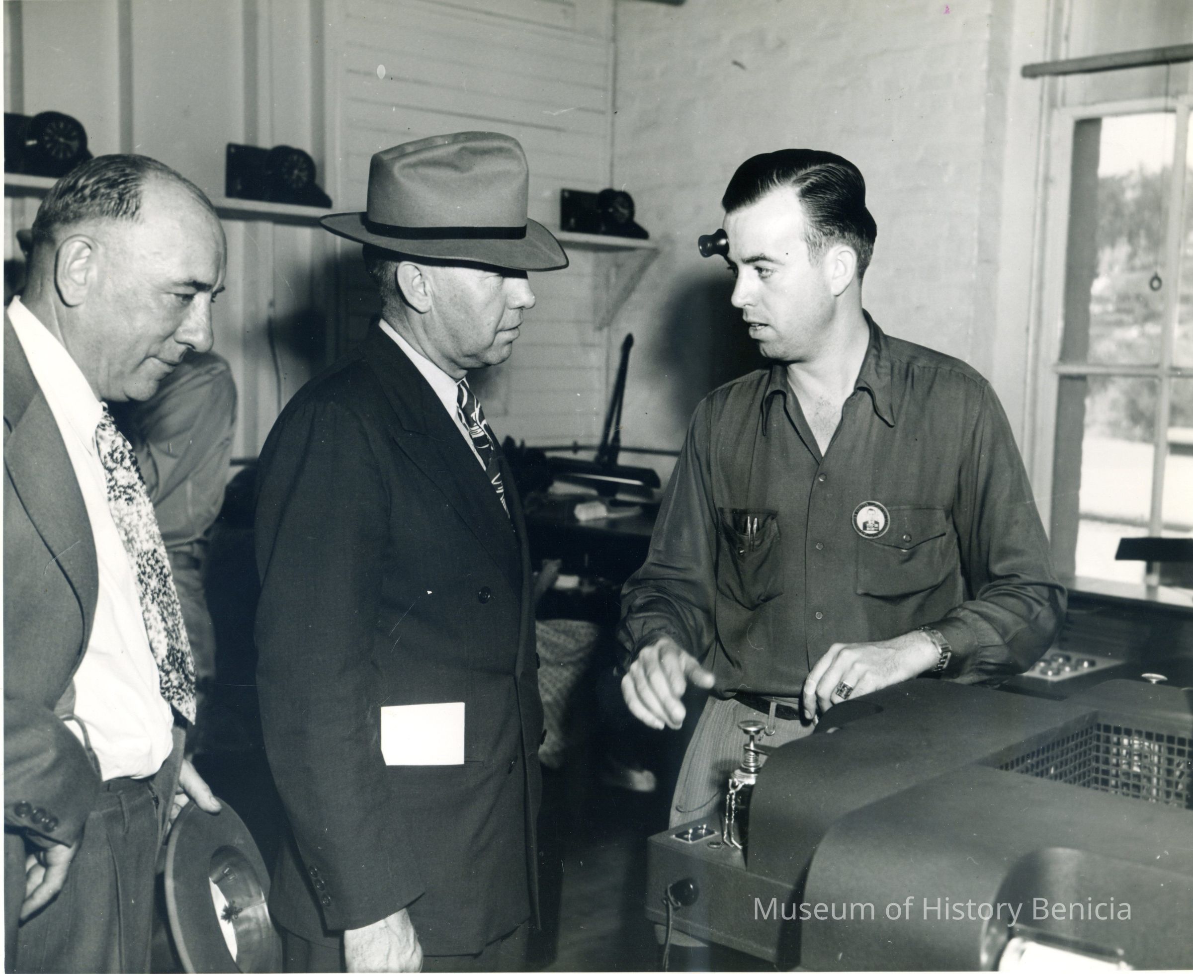 This is a photo of three people in a machine shop at the Benicia Arsenal. One man is the operator and the other two are observing. No names are shown on the back.Collection