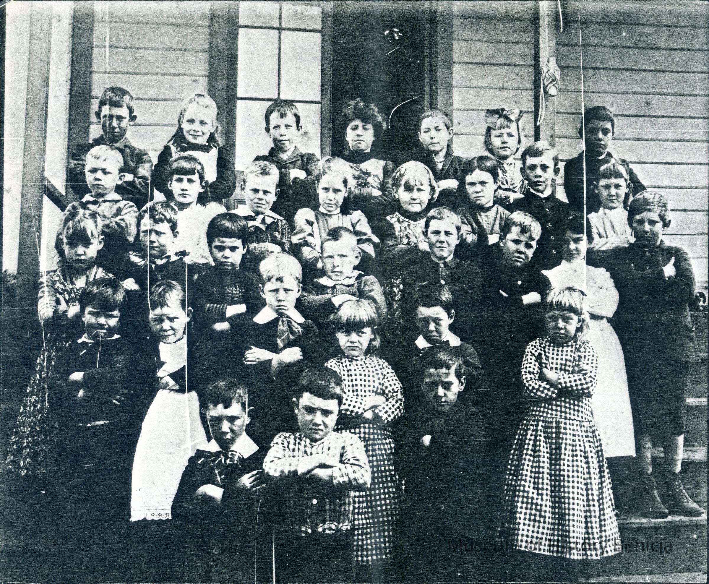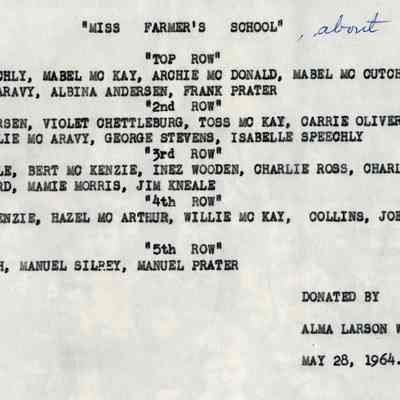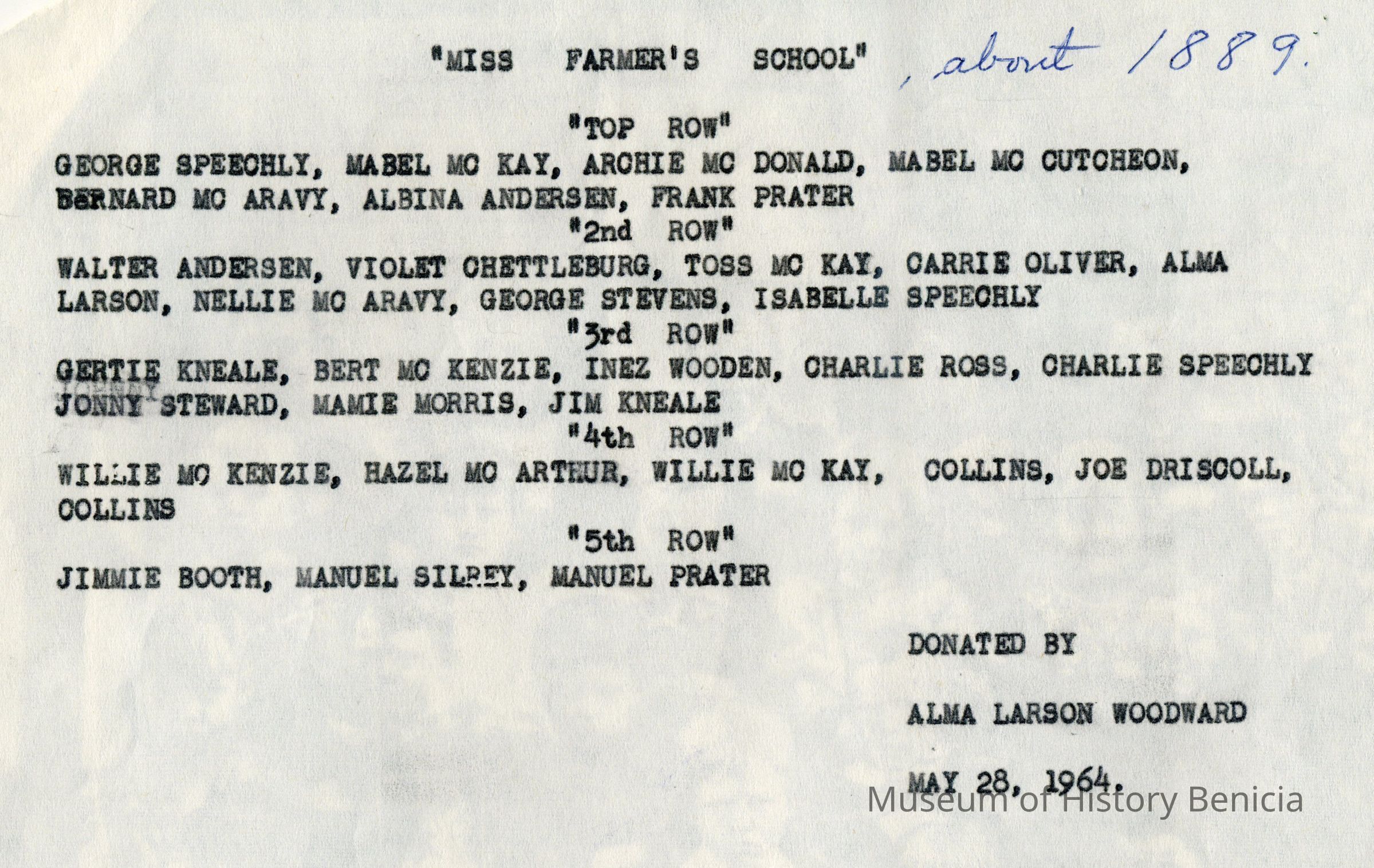 This is a photo copy of a photo of students at the Mary Farmar school about 1889. Identified are: