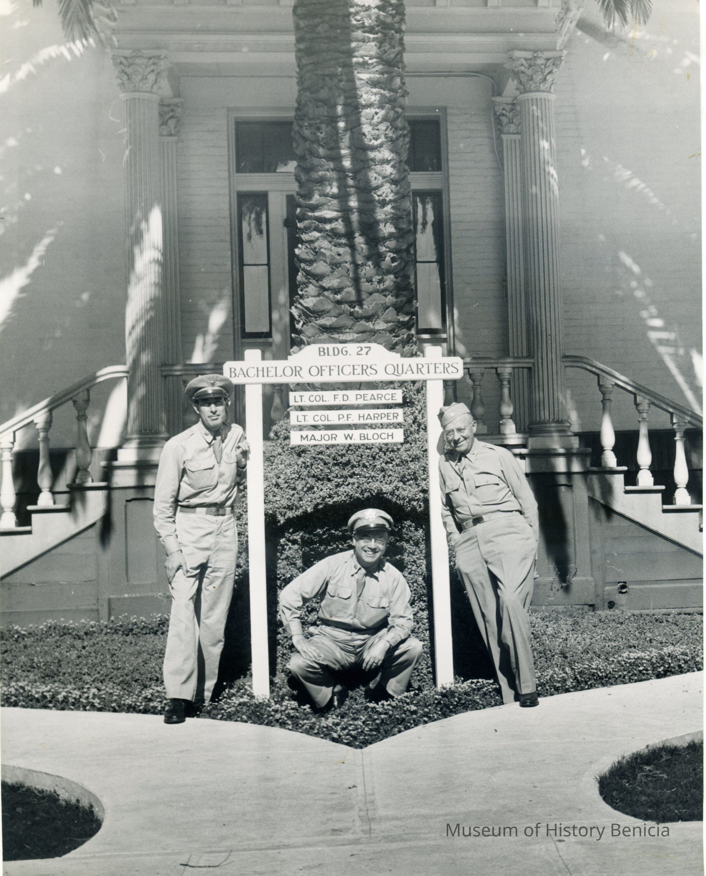 This is a photo of building No. 27 at the Benicia Arsenal. It is a Bachelor Officer's Quarters. Shown outside by the name sign are probably the three officers shown on the sign. They are Lt. Col. F.D. Pearce,