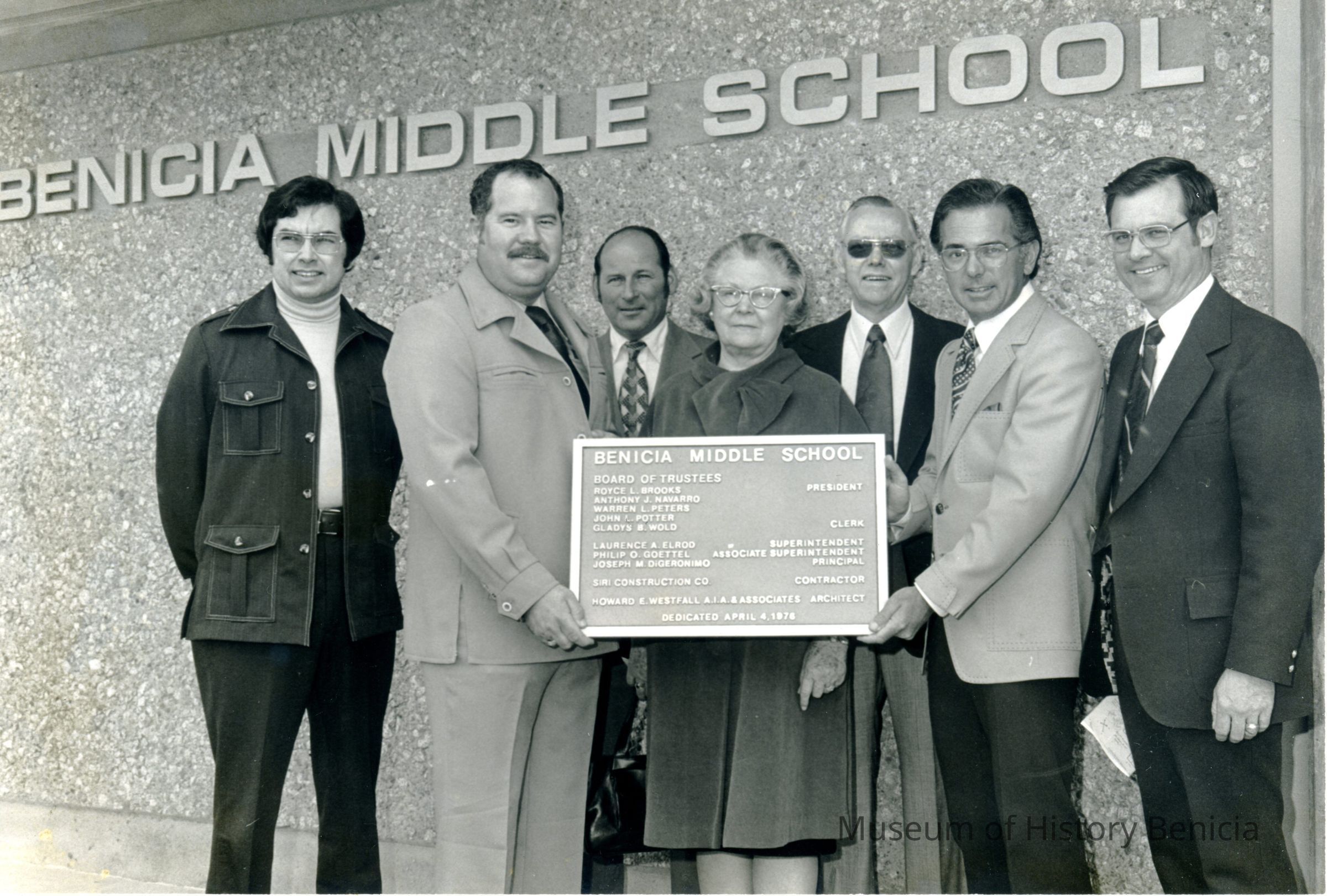 This is a photo of people standing outside the Benicia Middle School holding a plaque. I assume they are members of the Board of Trustees as shown on the plaque and others named on the plaque. On the back are the names