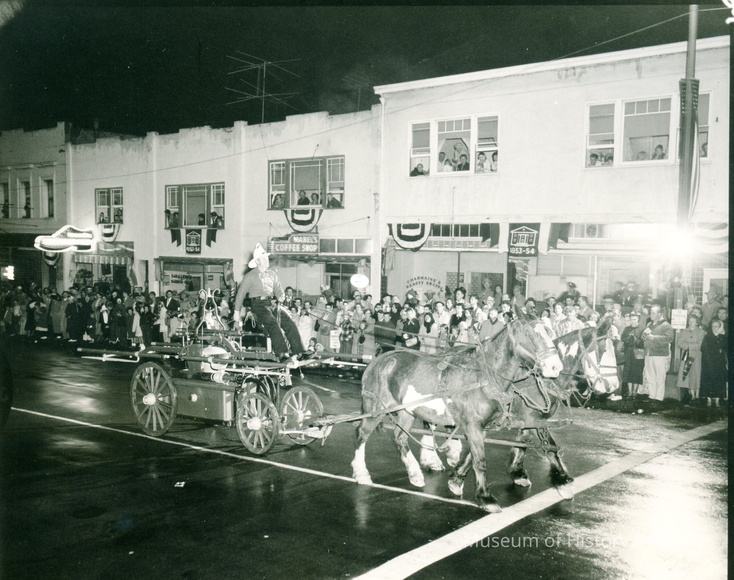 This is a photo of the celebration of the restoration of the old State Capitol in 1958. It shows the parade they had as part of the celebration. This photo shows a wagon with a fireman driving.Collection