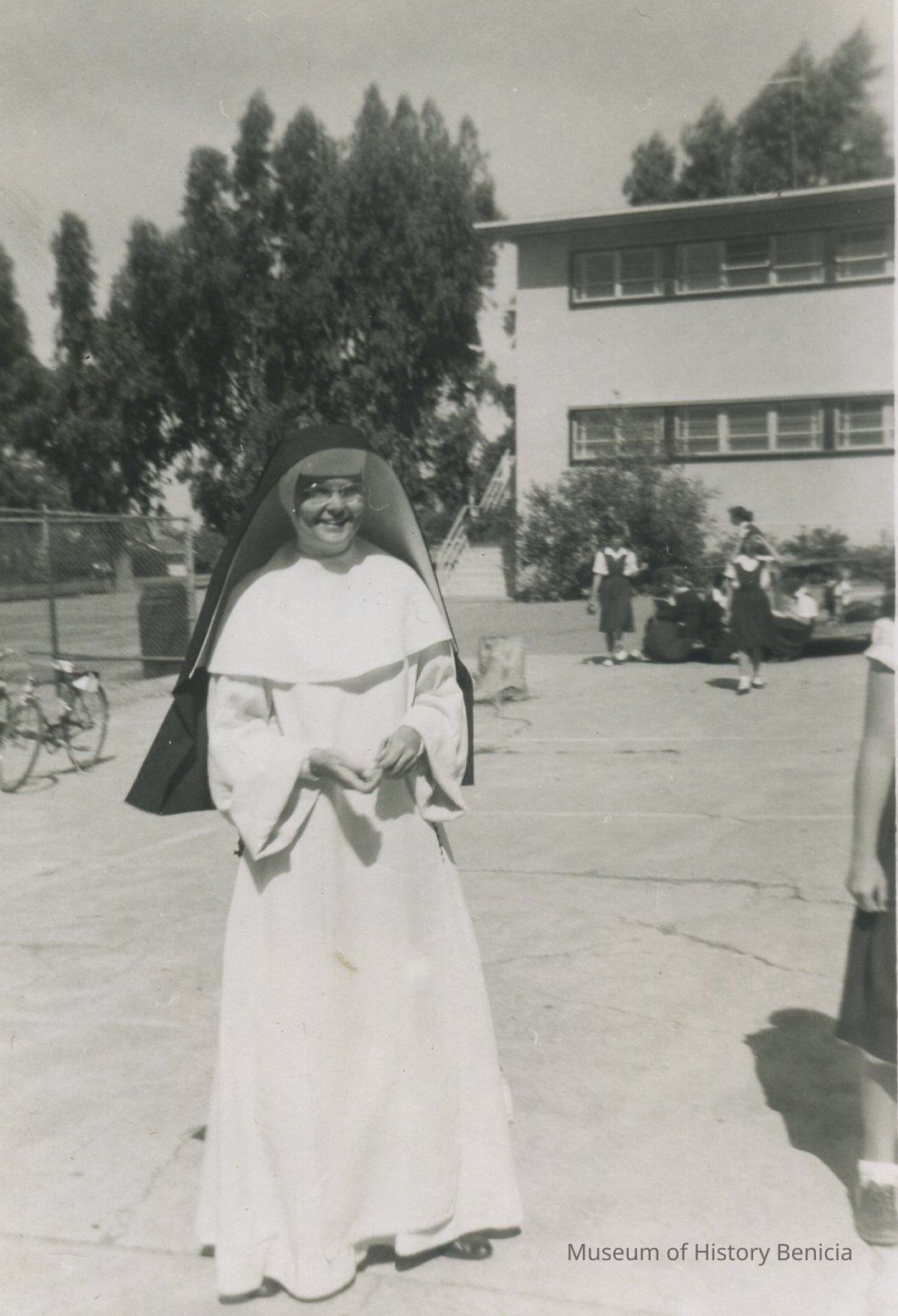 B/W photograph - St. Catherine's Academy playground, Dominican Nun, Sister Jude, on playground duty. Students in uniform are in the background.