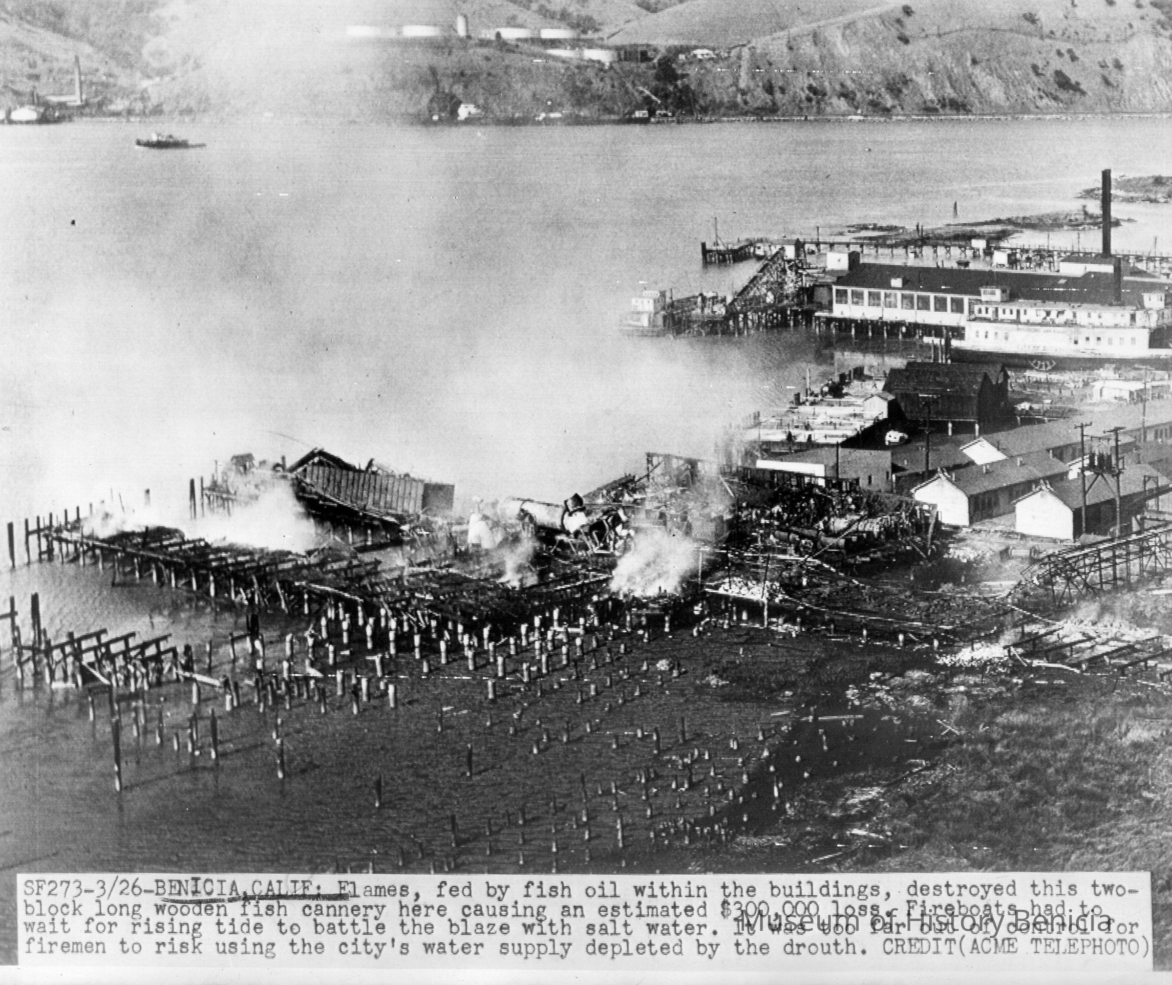 On front: SF273-3/26 Benicia, Calif.: Flames, fed by fish oil within the buildngs, destroyed thie two-block long wooden fish cannery here causing an estimated $300,000 loss. Fireboats had to wait for rising tide to battle the blaze with salt water. It was too far out of conrol for fireme to rish using the city's water supply depleted by the drouth.(sic) Credit (Acme Telephoto).