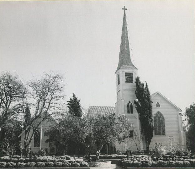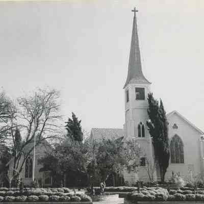 B/W Photograph originally under glass in a black frame with gold trim. The photograph is glued to a mat board. The caption reads "Old" St. Paul's Episcopal Church was built in 1859, the first Episcopal Cathedral for Northern California. Work was done by Scandinavian shipwrights from the Pacific Mail and Steamship Co."Collection