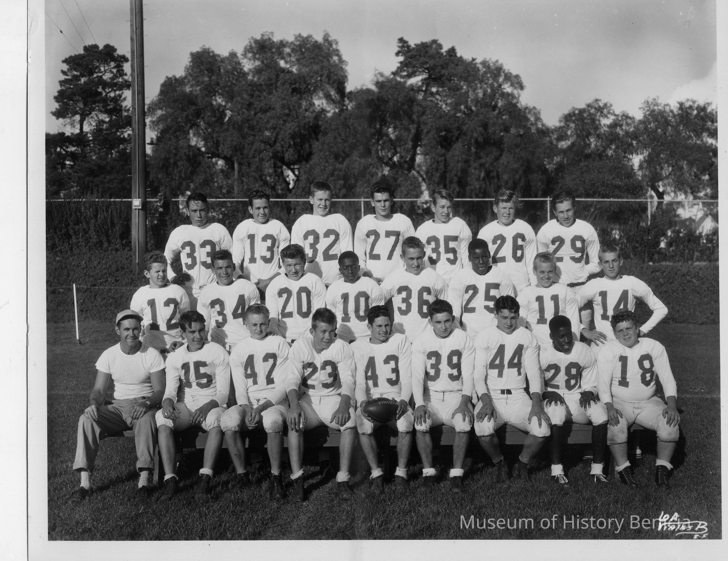 B/W Photograph of the Benicia High School 1949 Junior Varsity Football Team; photograph was taken on Sanborn Field and it appeared in the 1950 BHS Yearbook; Their recird was 4-1.