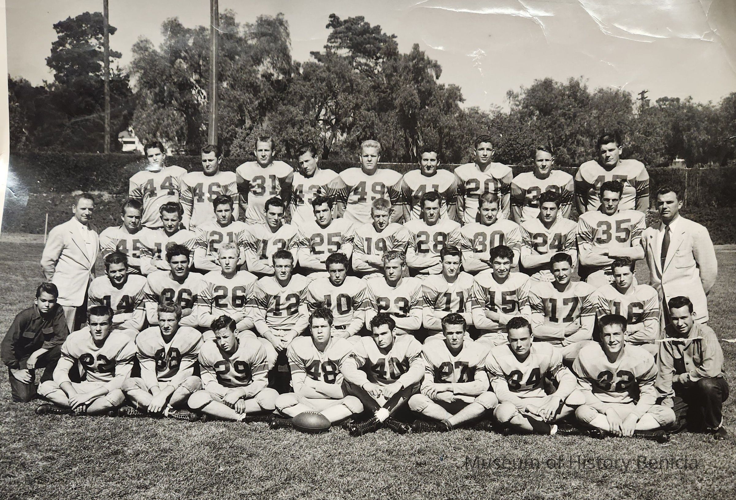 B/W Photograph of the 1953 Benicia High School Football Team; they were an undefeated championship team; the photograph was taken on Sanborn Field which was next to the school. (Benicia City Hall and the U.S. Post Office now occupy the area.)