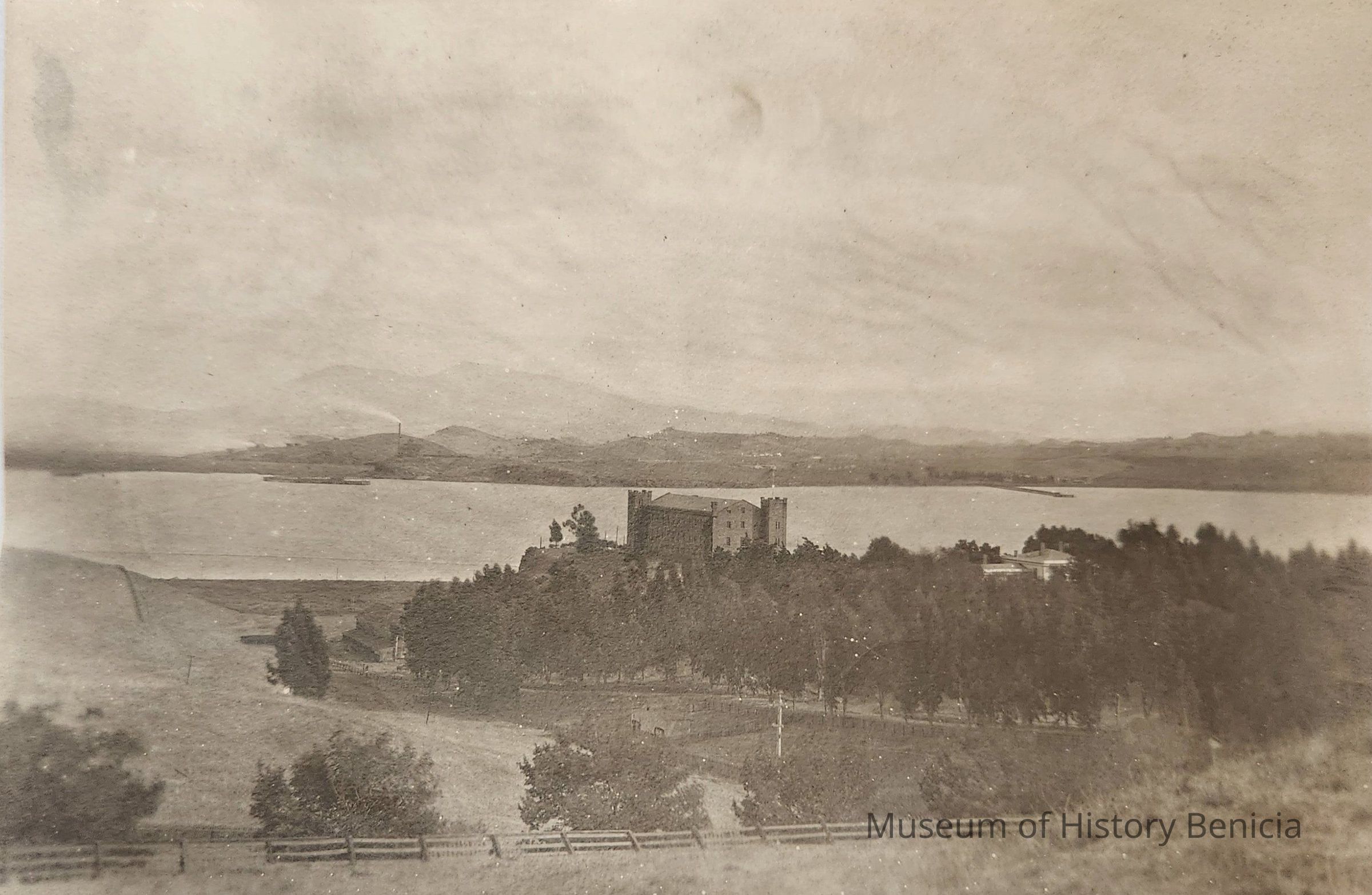 B/W photograph of the Clock Tower prior to 1912 with the Carquinez Strait and Contra Costa County and Mt. Diablo in the background;