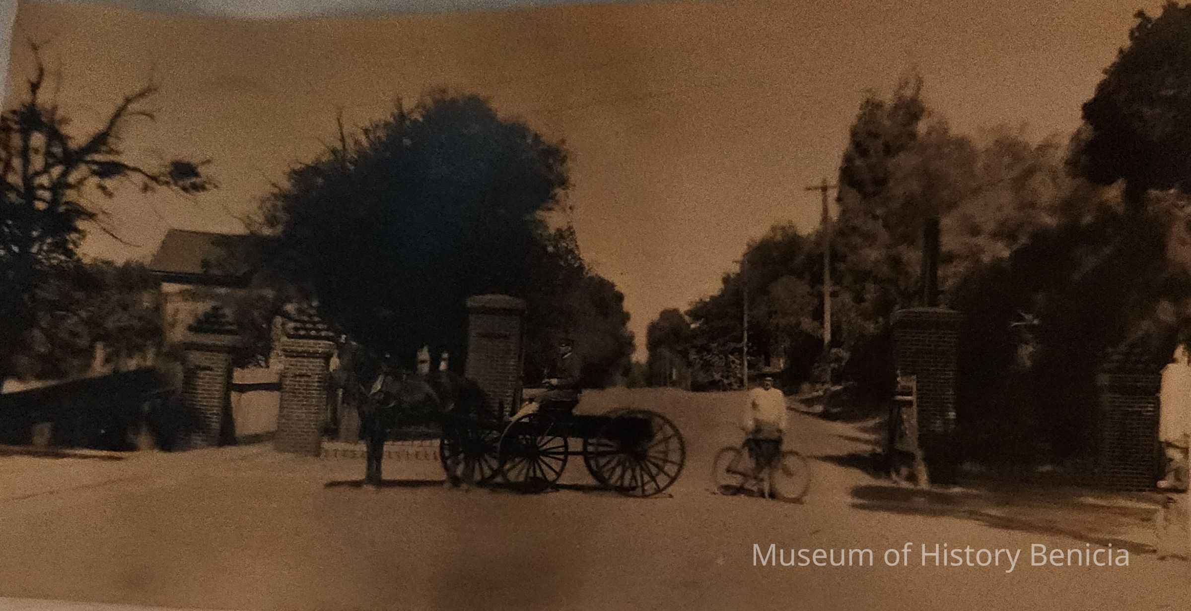 B/W photograph of a Benicia Arsenal Gate; in front is a uniformed man in a horse-drawn cart and a man with a bicycle; size: 2-3/4" x 5-3/8"