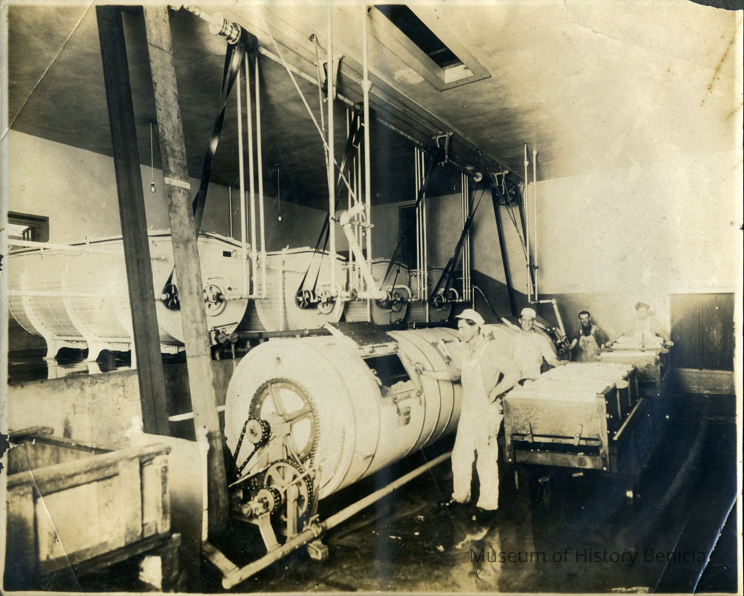 B/W Photograph in Frame: Inside view of the Benicia Creamery in 1920s. Four workers are next to processing equipment. Clyve Ross supervised the Benicia Creamery during this period (not in photo).