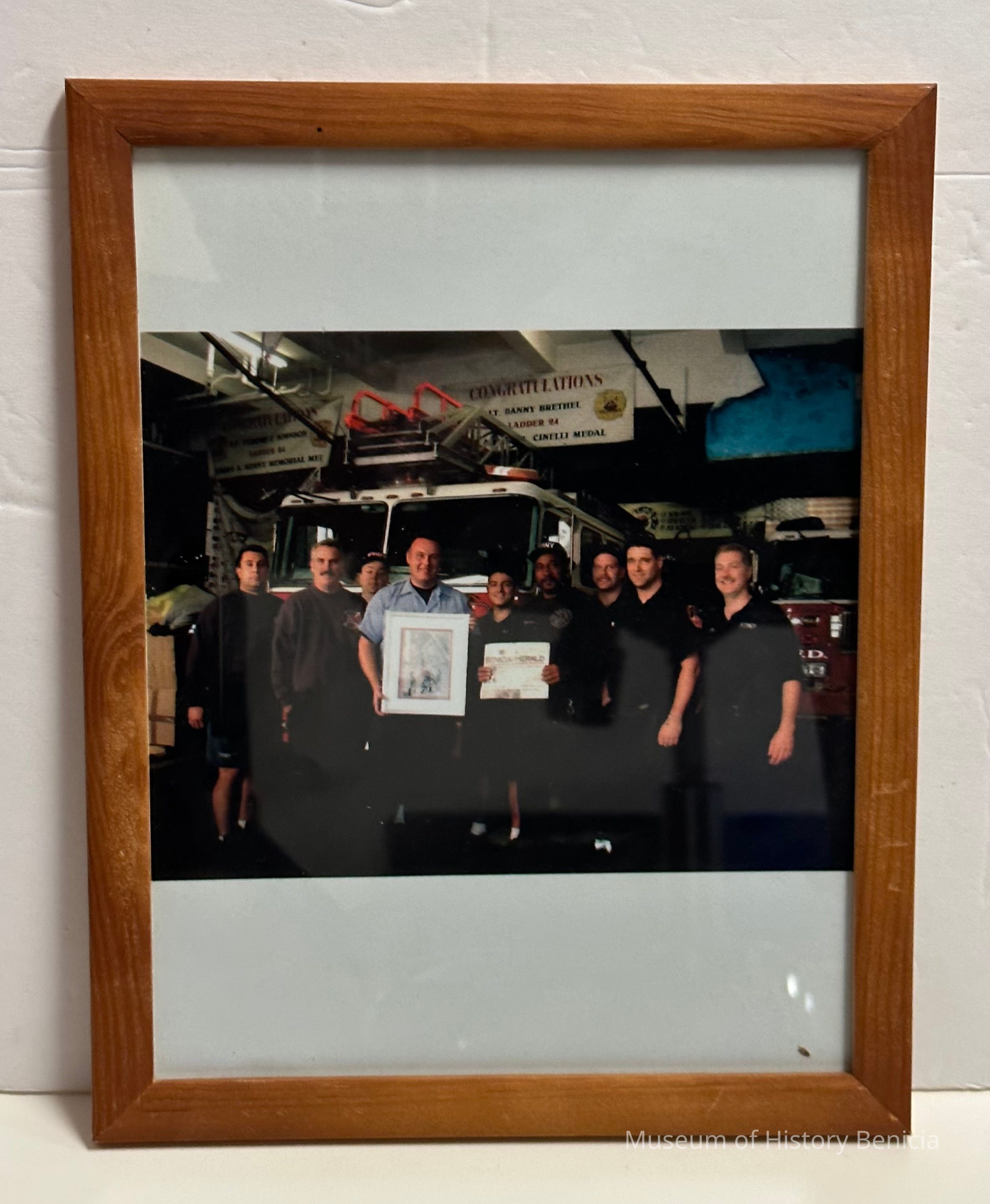 Framed color photograph of the nine firemen at a congradulatory celebraltion.
