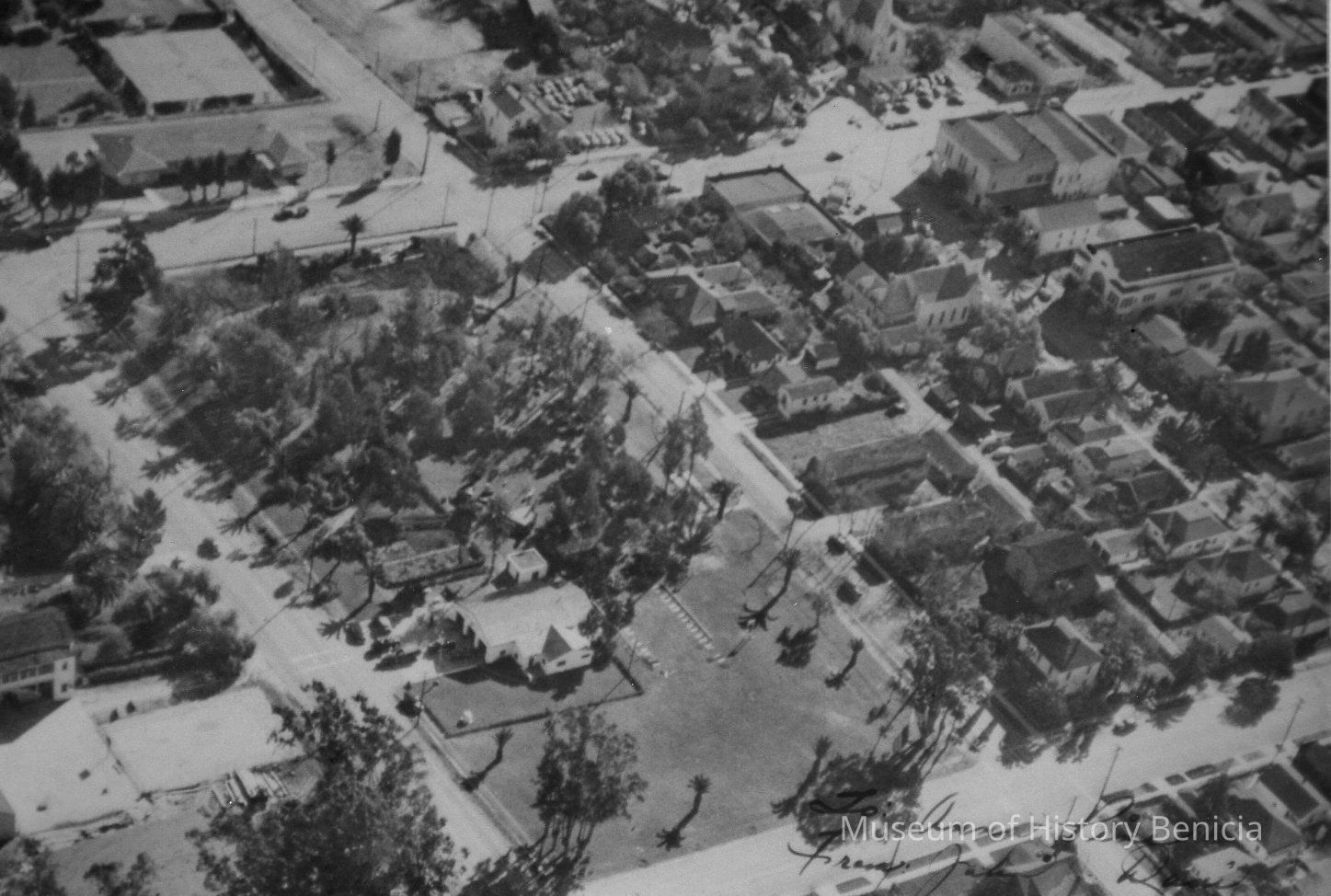 B/W aerial photo focus on City Park and fire station. Buildings on First St and Between First and West Second and on West L are visible.