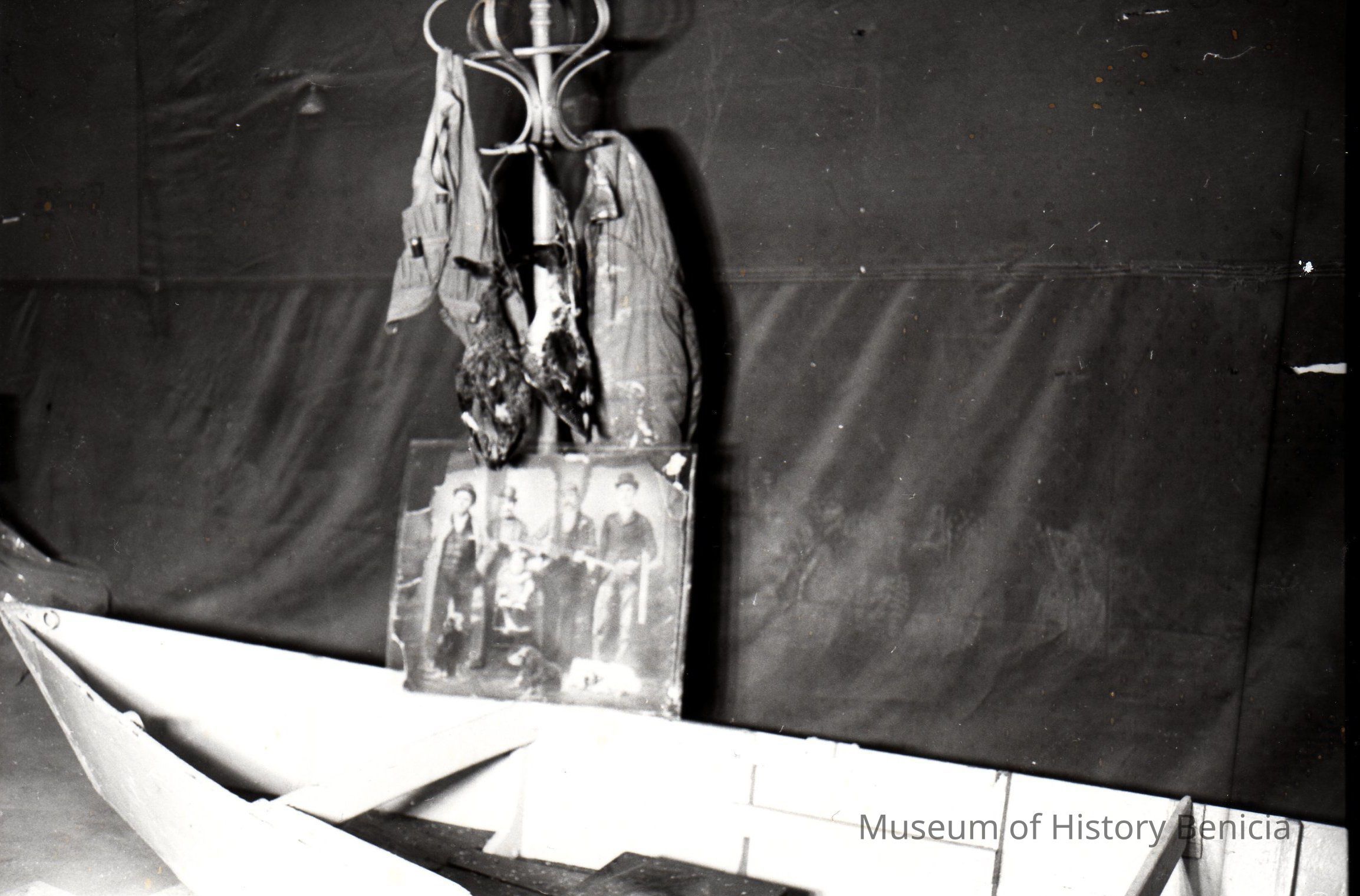 B/W photograph of items from collection of hunting artifacts. Items shown are: old hunter's shell vest and shells, a coat, two ducks hanging from a "duck strap," and photo of duck hunters with their dogs and the duck boat "Pick Axe".Collection
