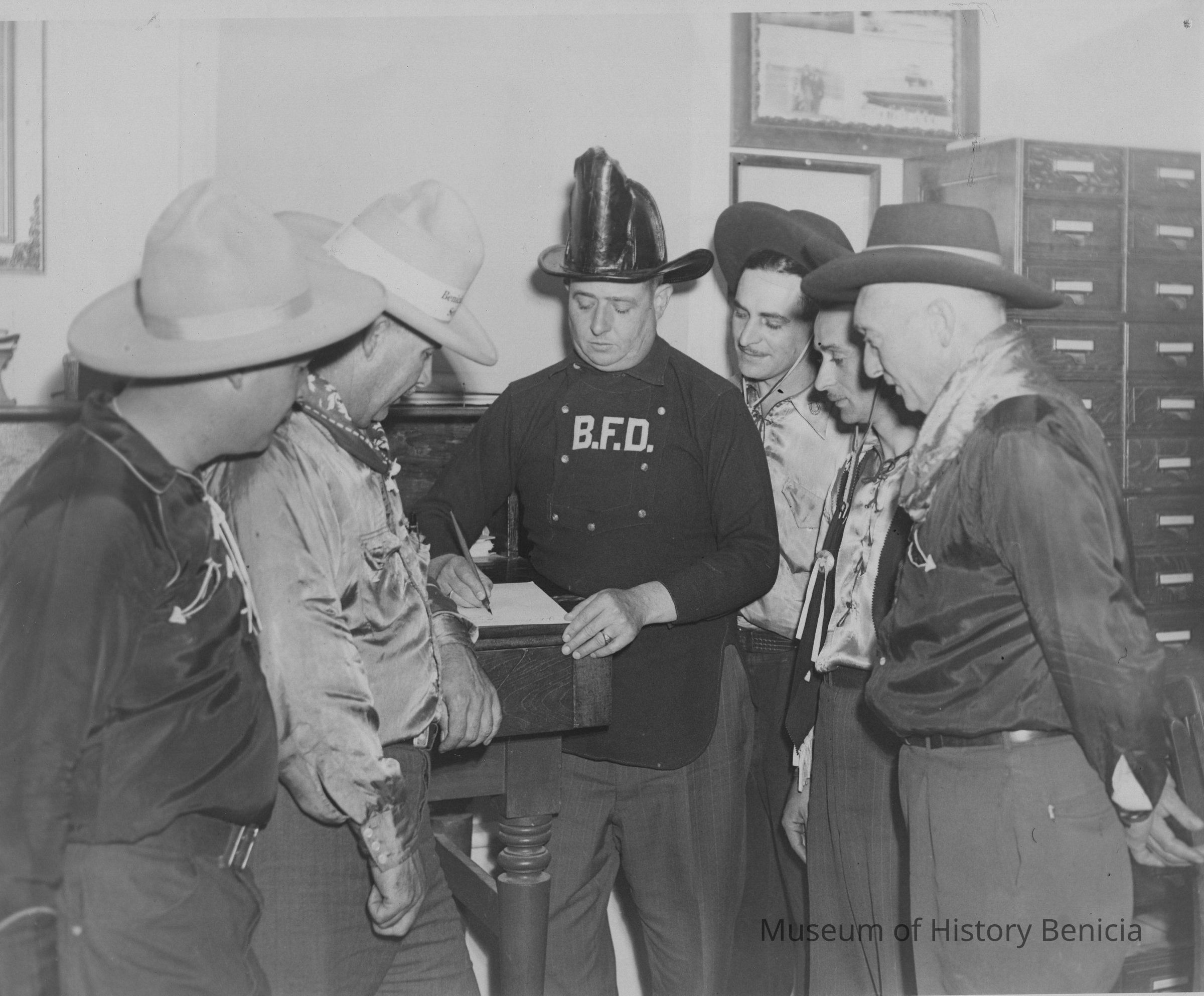(1) Steve DeBenedetti, Mare Island employee (far right). (2) John Alves (3) Joaquin Gonsalves (4) center man--unknown (5) and (6) unidentified. Old Timers Day celebration (see hat band). Black and white photo.
