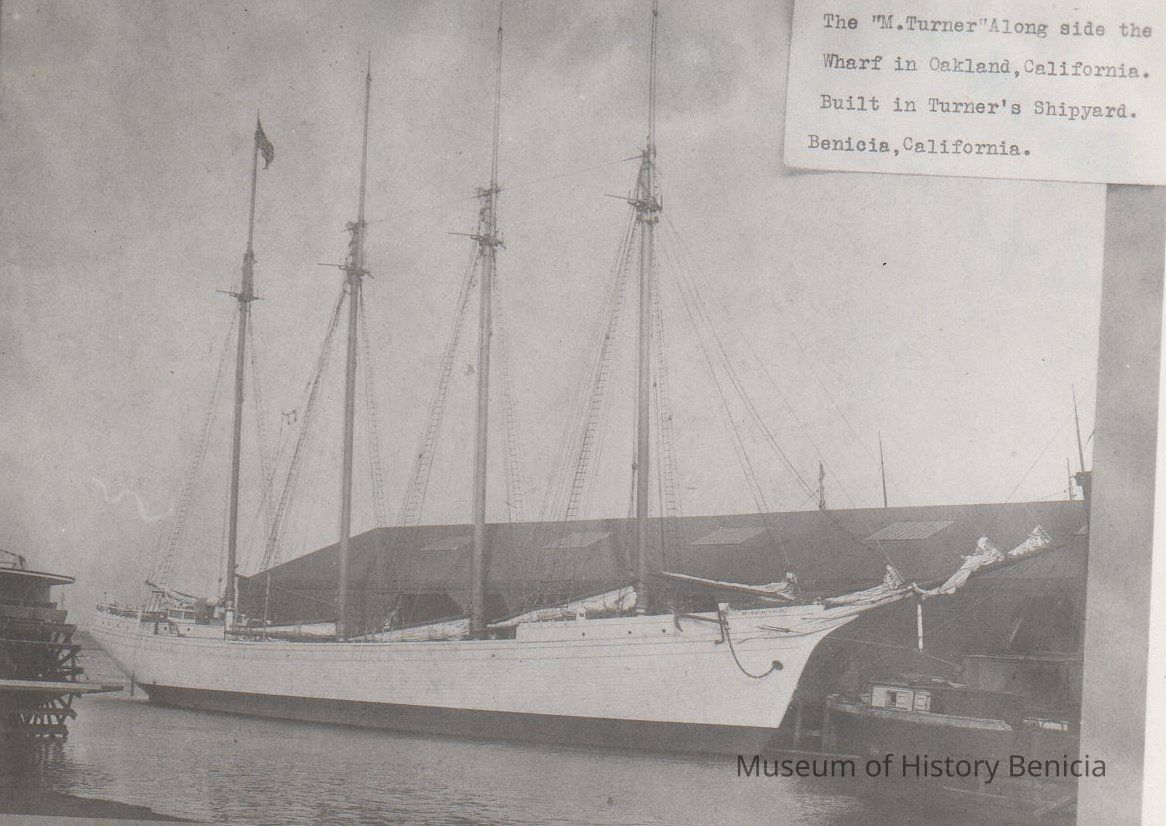 B/W photograph of a photograph: sailing ship "M. Turner" at Oakland wharf. Named after shipbuilder Matthew Turner, she was built at Turner's Benicia shipyard in 1902.Collection