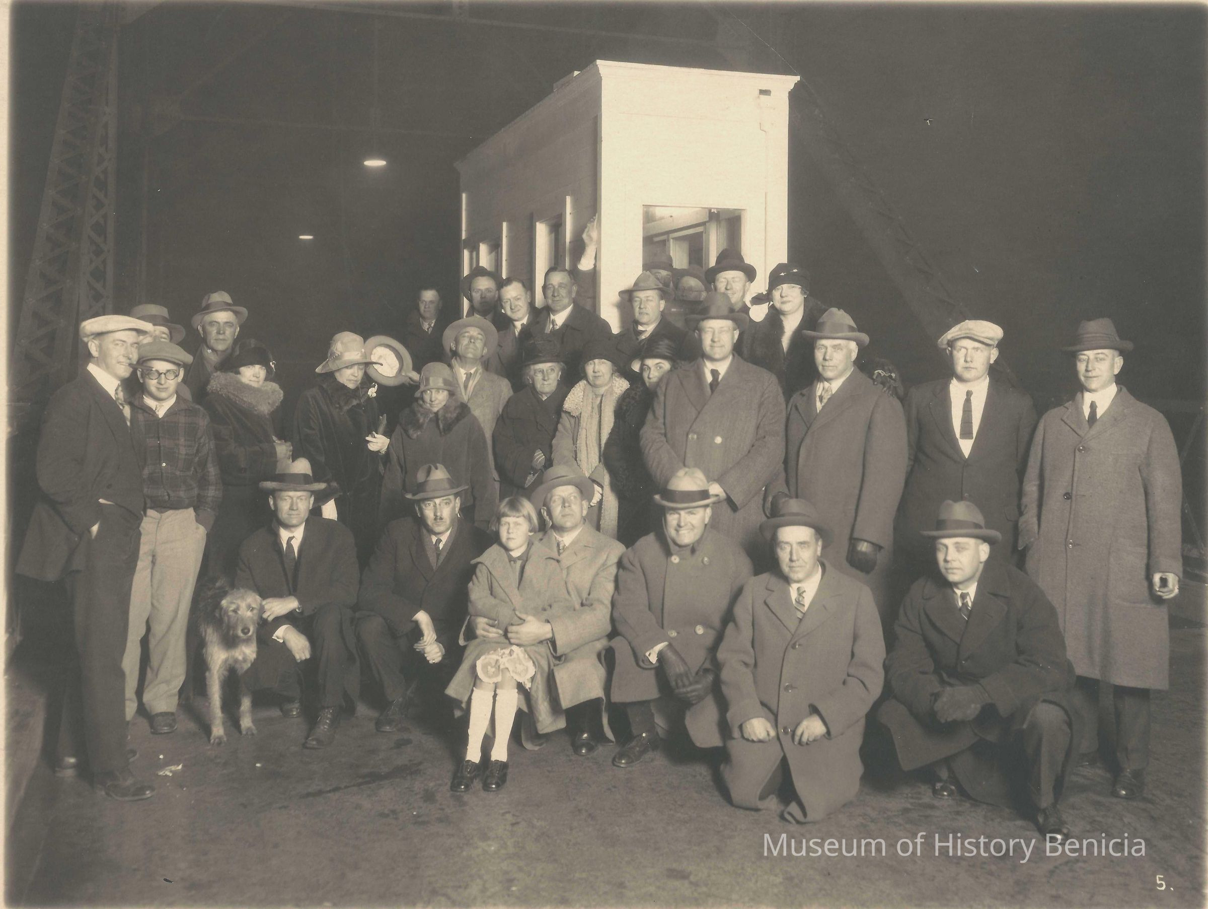 Carquinez Bridge dedication? Group of men and women, one girl and dog on bridge at right. Photographer's stamp on back.
