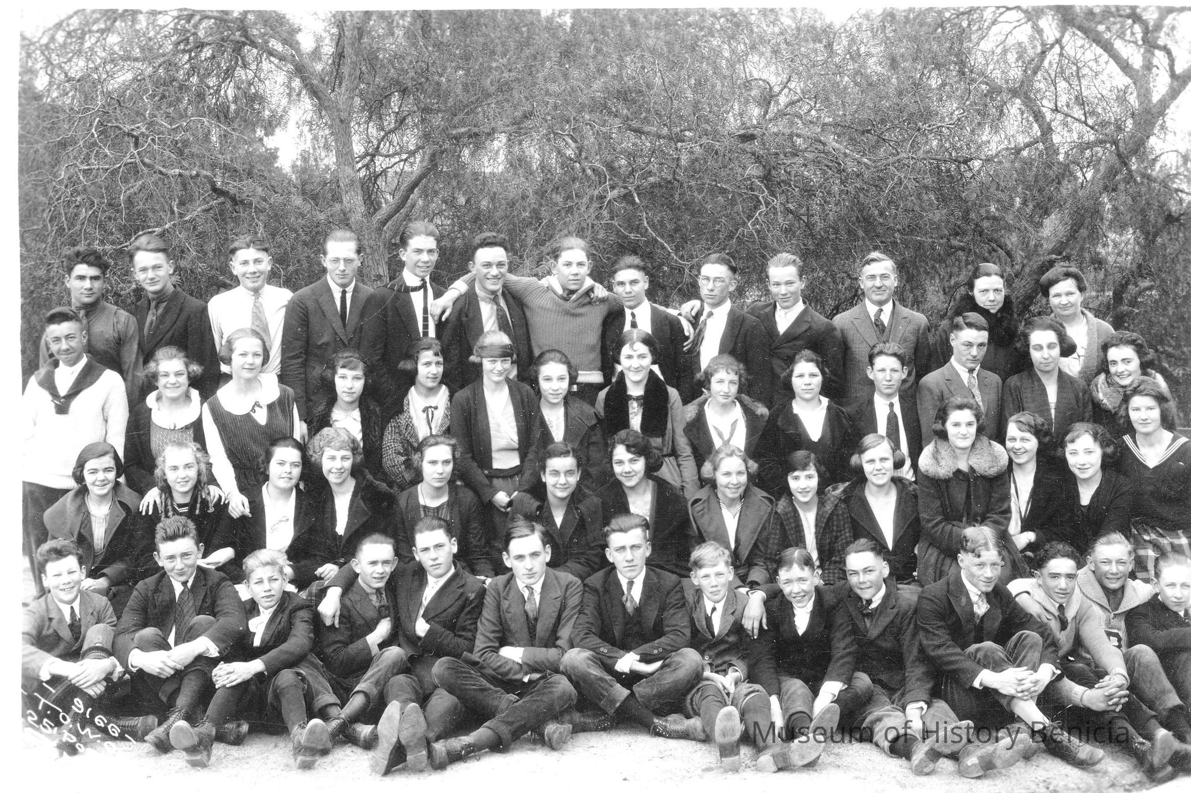Photo on paper of a graduating class. The photographer is "T.O.W. 25 Post S.F.". On the back it says V Molfino. It is probably Violet Molfino of Benicia who is in the picture on the left, one from the end, of the third row from the bottom. (She is next to the guy with the sweater tied around his neck. The photo is numbered 9166.Collection