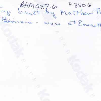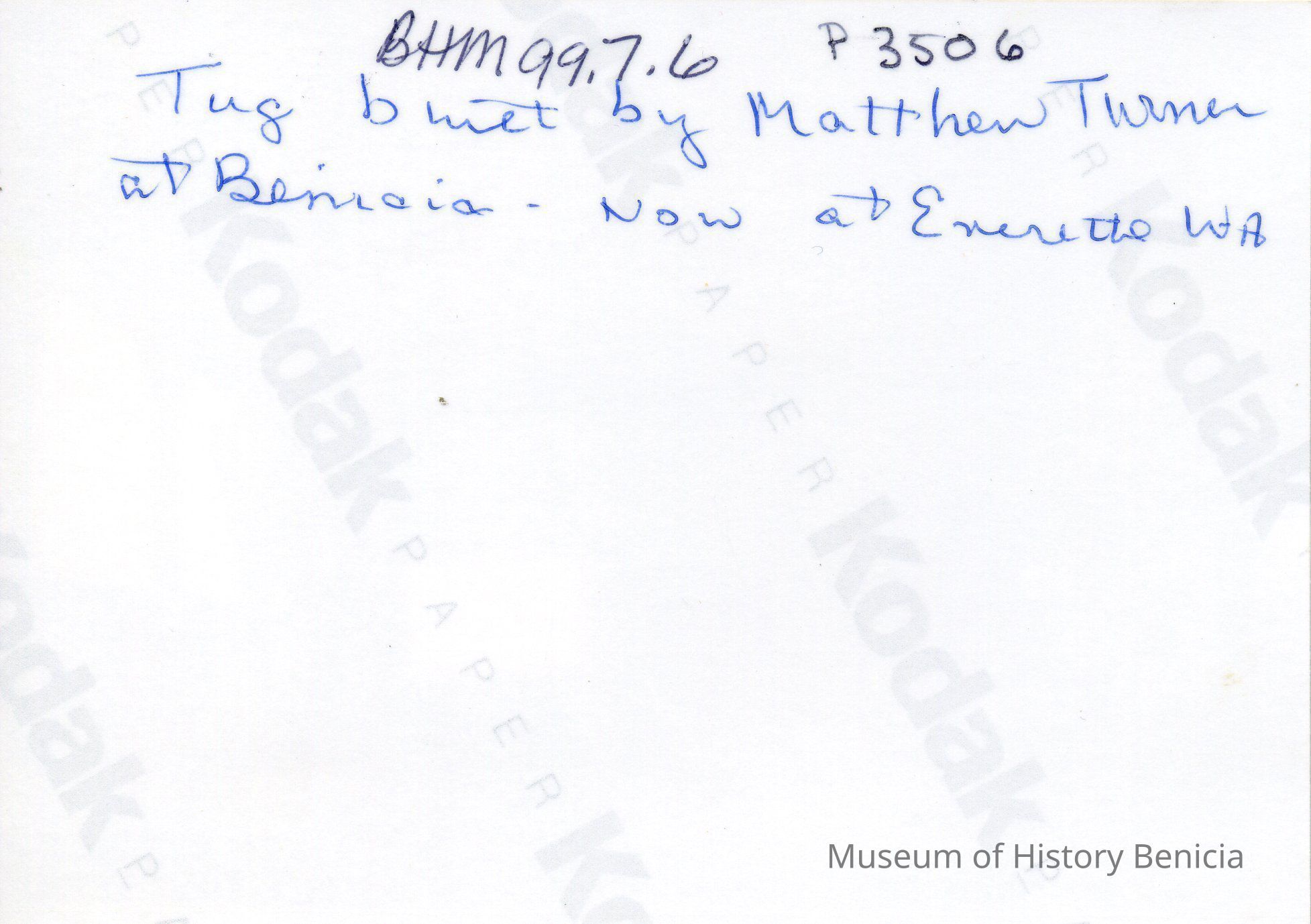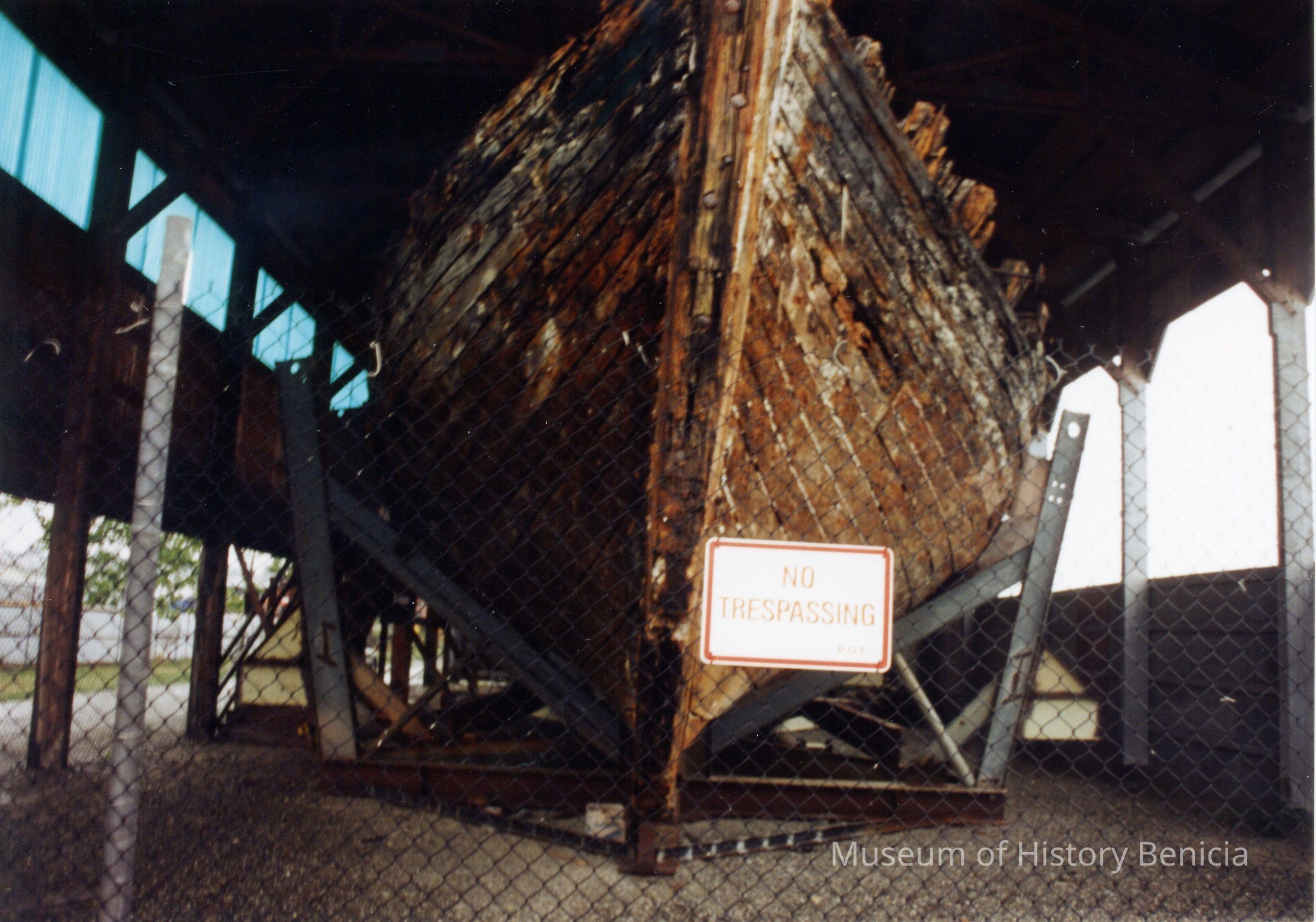 color photo shows an old wooden boat hull under a roof, surrounded by chain-link fencing; a "No Trespassing" sign is attached to the fence; on the back of the photo is written: "Tug built by Matthew Turner at Benicia - now at Everett WA."Collection