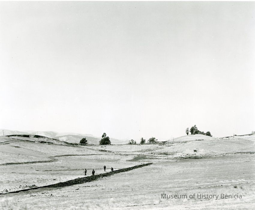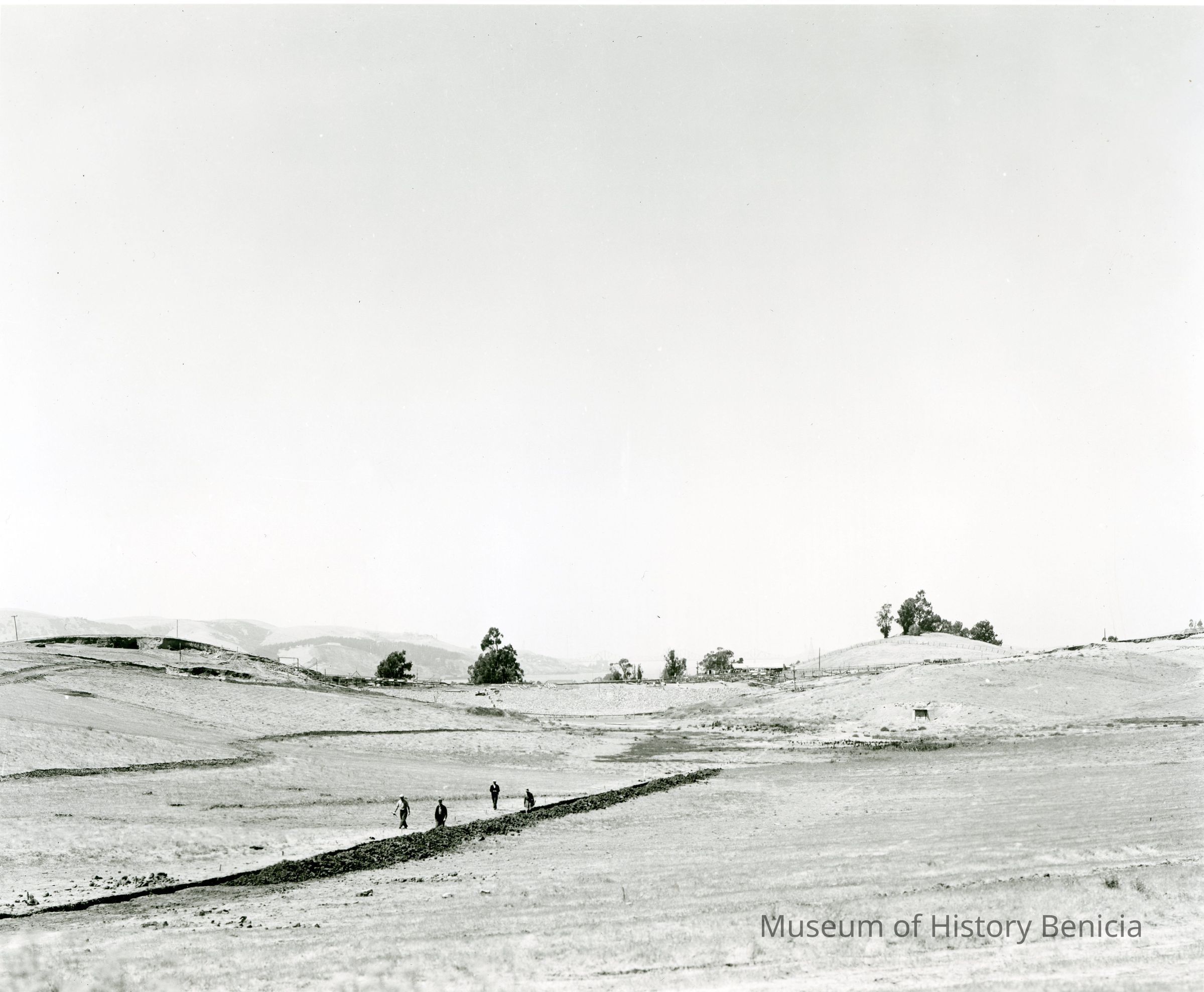 This is a photo of men digging a trench. Not sure where this photo was taken. In the background it looks like an elevated water line. There may be a railroad line back there too.Collection