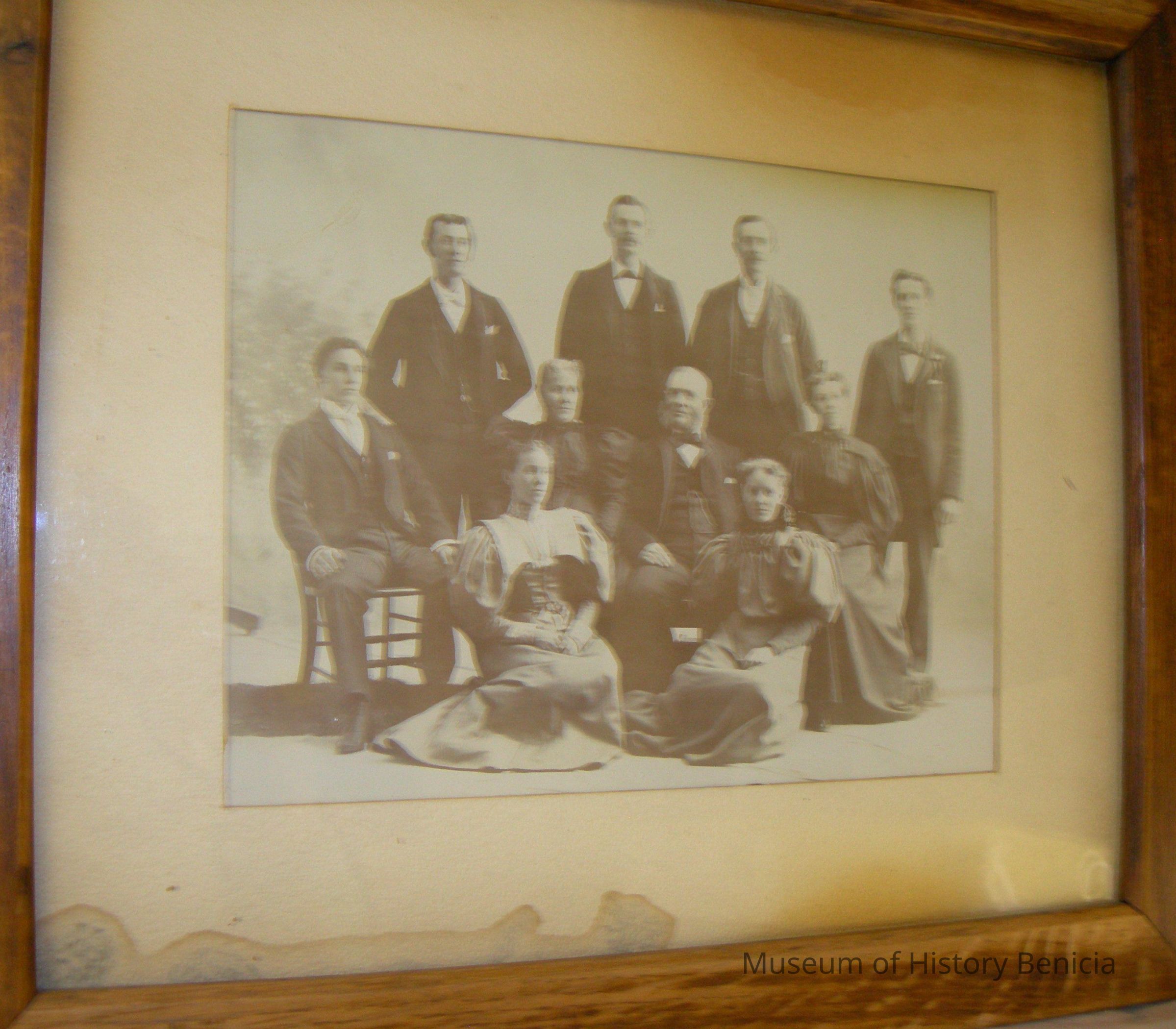 B/W framed photograph of six gentlemen in suits and four ladies in Sunday dress; appears to be a family (Simpson's ??) group in the early 1900's