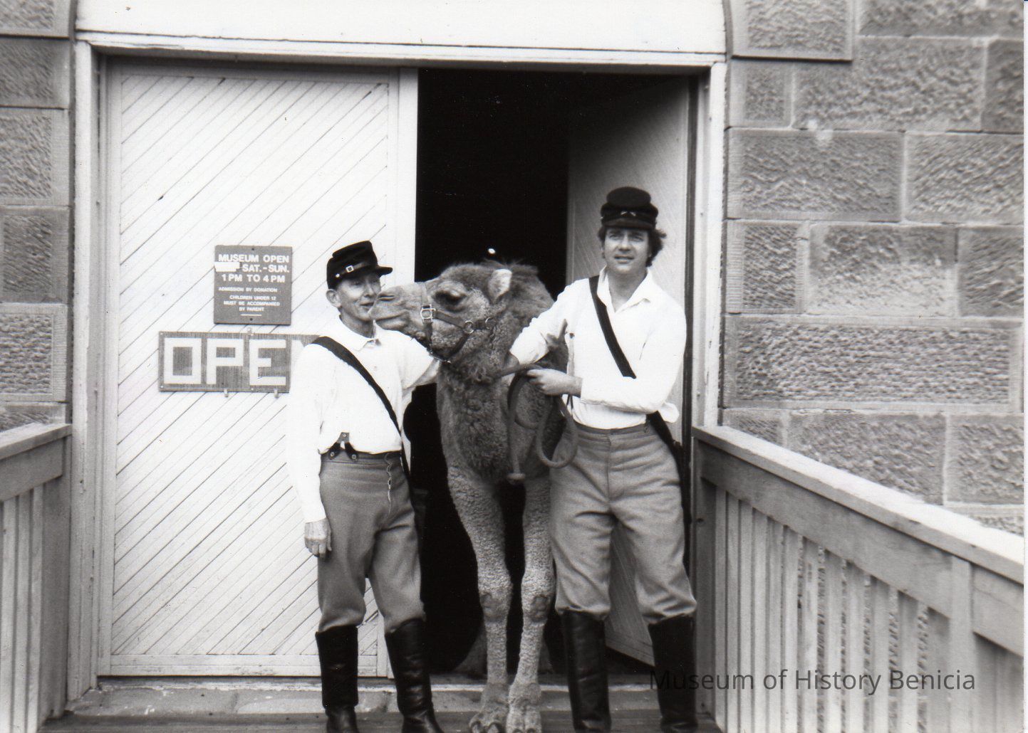 Camel named "Atar" visits the Camel Barn Museum. Civil War buffs in uniform are L/R Larry Rogers and David Stevens. 1989 B/W photoCollection