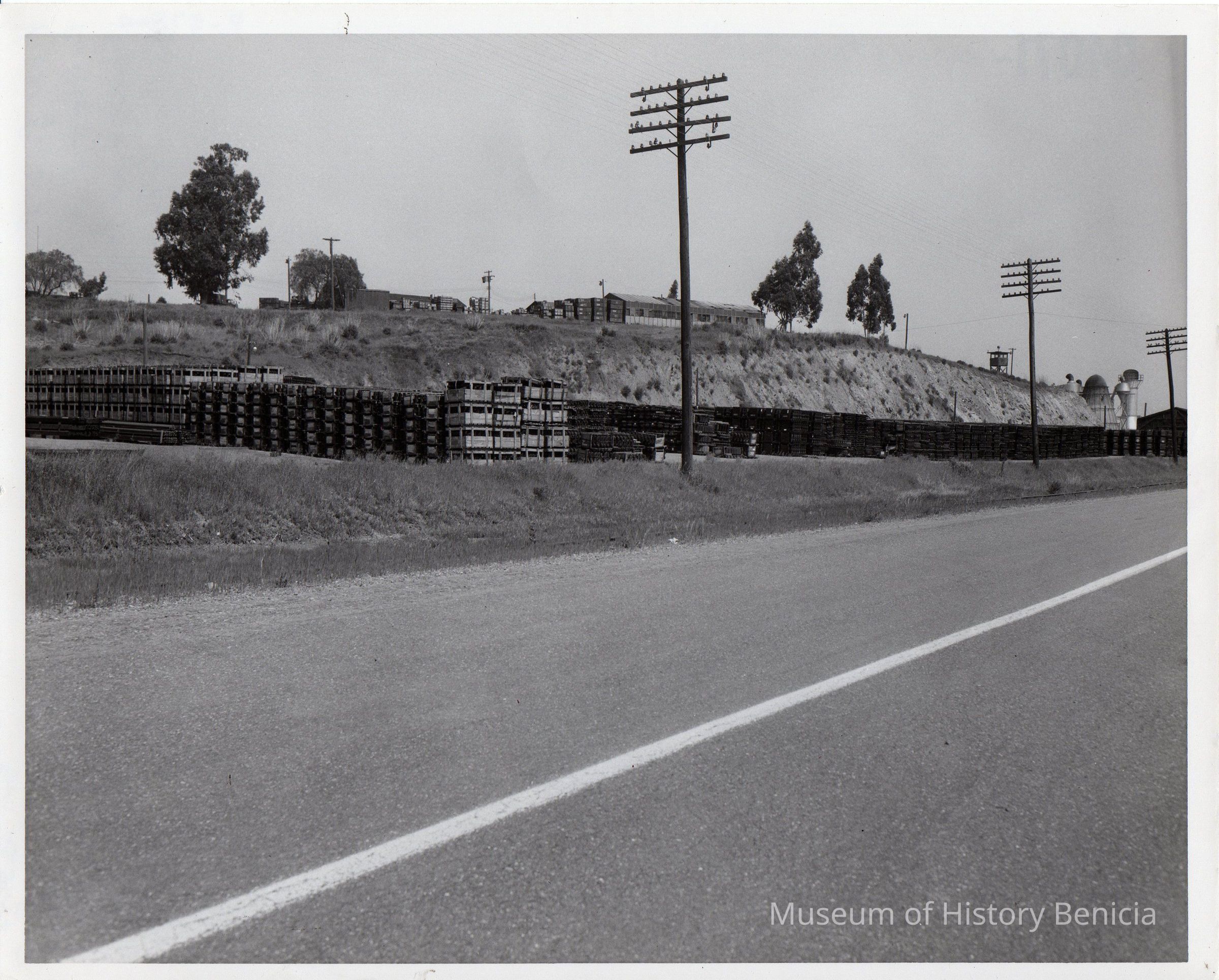 B/W view from Bayshore Road of Bottle Hill area, storage buildings.