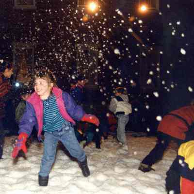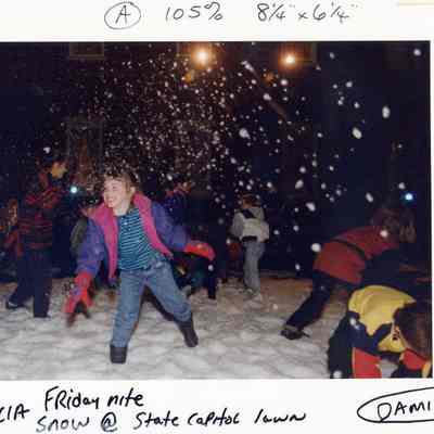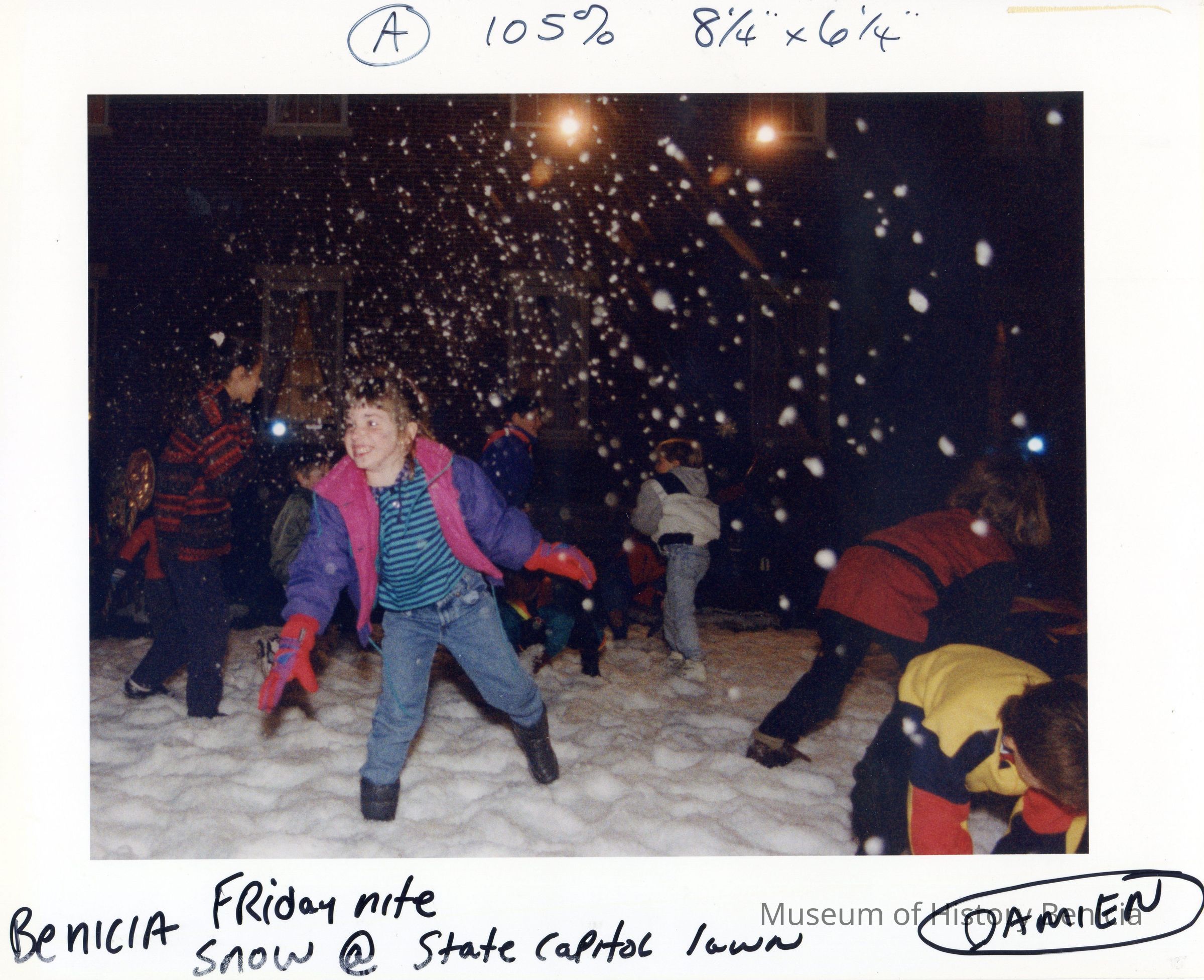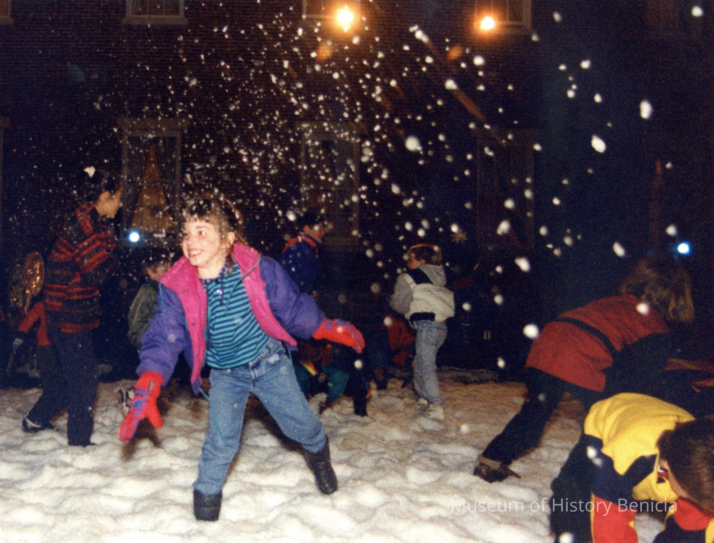 Color photograph of children playing in the snow at night on the Benicia State Capitol lawn.