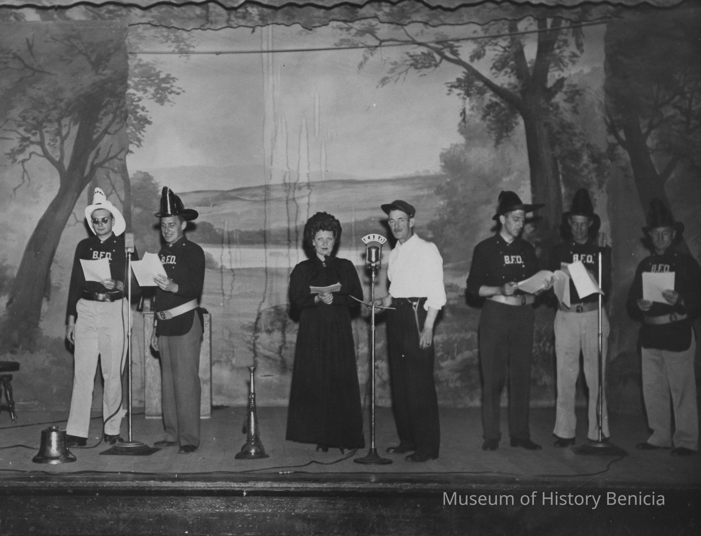 Skit being performed by the Benicia Fire Department. The stage was located in the Capitol Building. Mike Walsh is in the white shirt in center. B/W photo.Collection