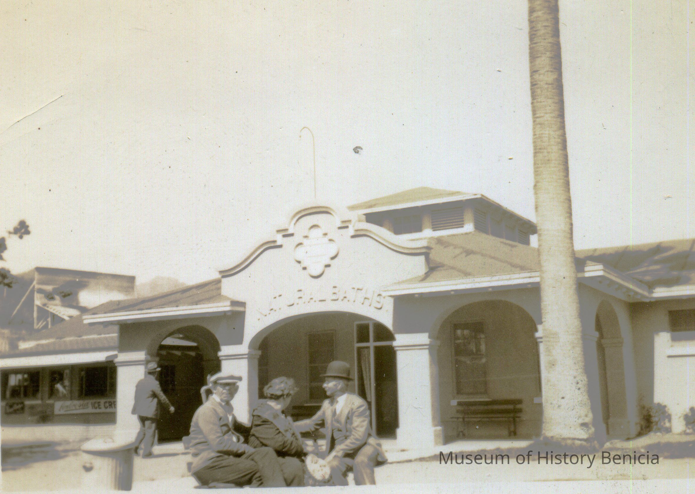 Photo of men in front of a building named "Natural Baths". Photo of men in front of a building named "Natural Baths".