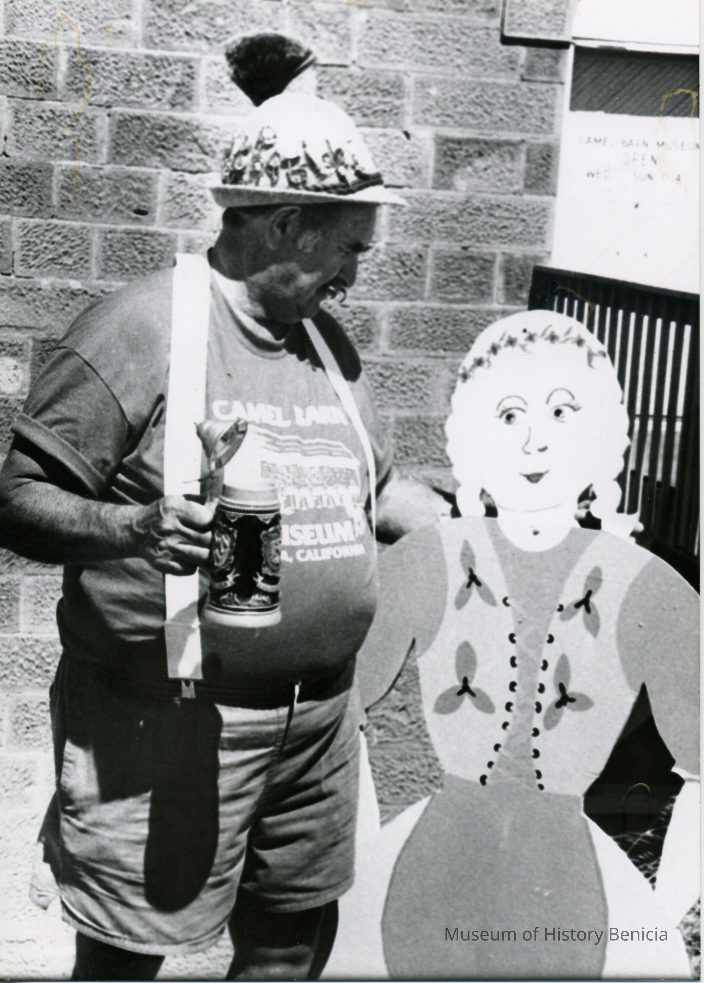 Ron Rice and cut-out of bar maid-photo used for publicity for 1994 "Octoberfest". Black and White photo.