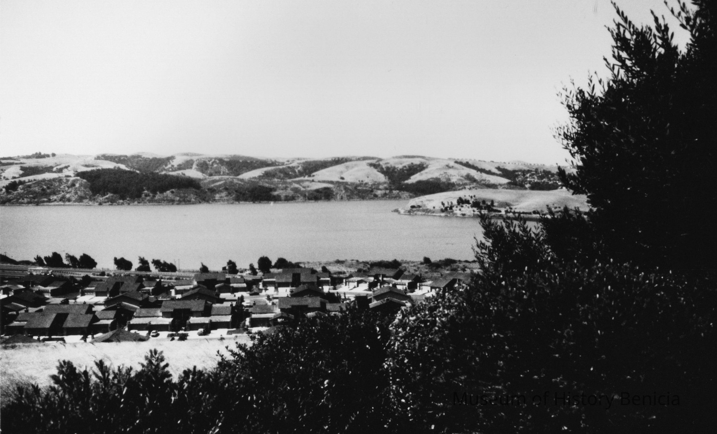 B/W photograph of houses possibly on London Circle (?) as seen from the top of an adjacent hill. The Carquinez Strait is in the background.Collection