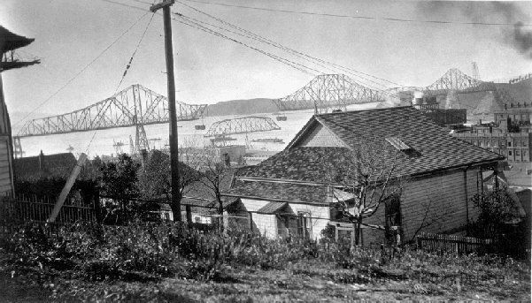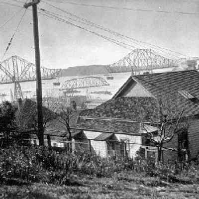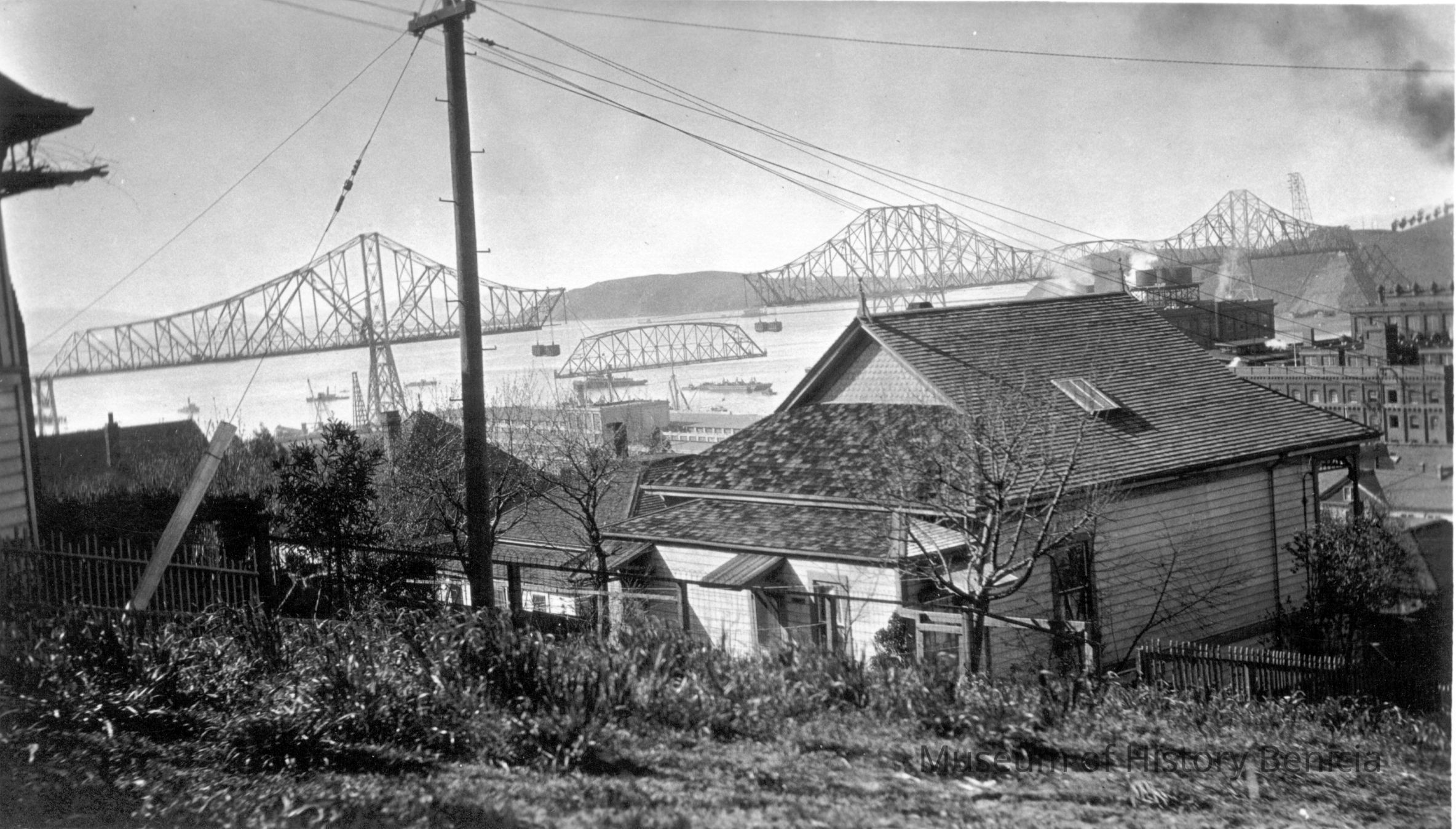View from Crockett hillside of section being lifted into place. "Johnson Glen Cove" and "Placing final span on Carquinez Bridge (from Crockett side) 1927" written on back by Harry Wassmann. Black and white photo.Collection