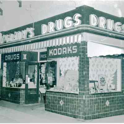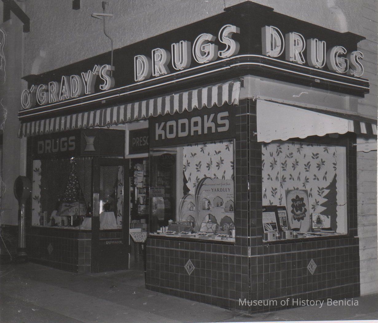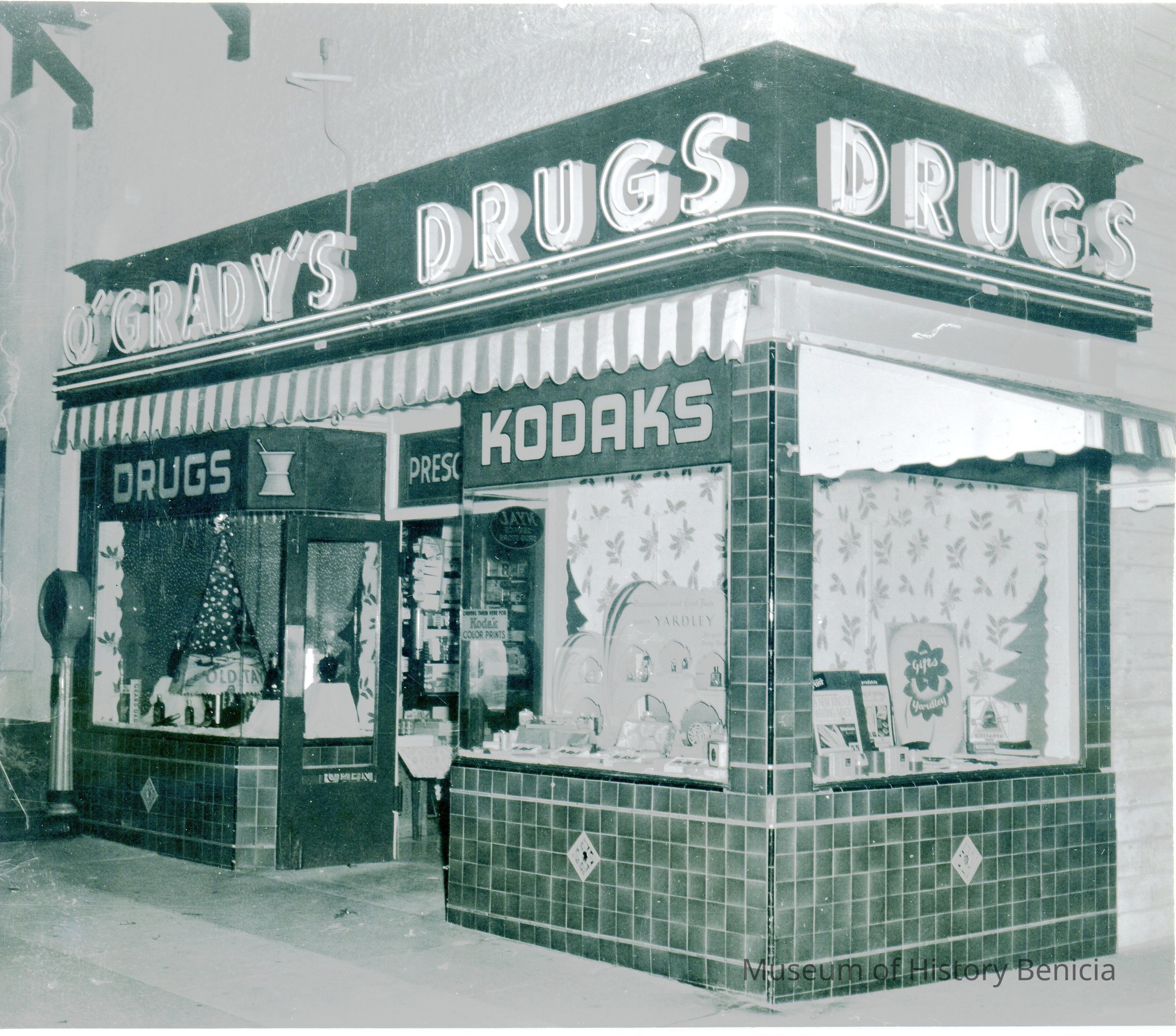 B/W Photograph: John O'Grady's Drugstore, Benicia, corner of First and East G Streets. Window decorations indicate it is the Christmas season.Collection