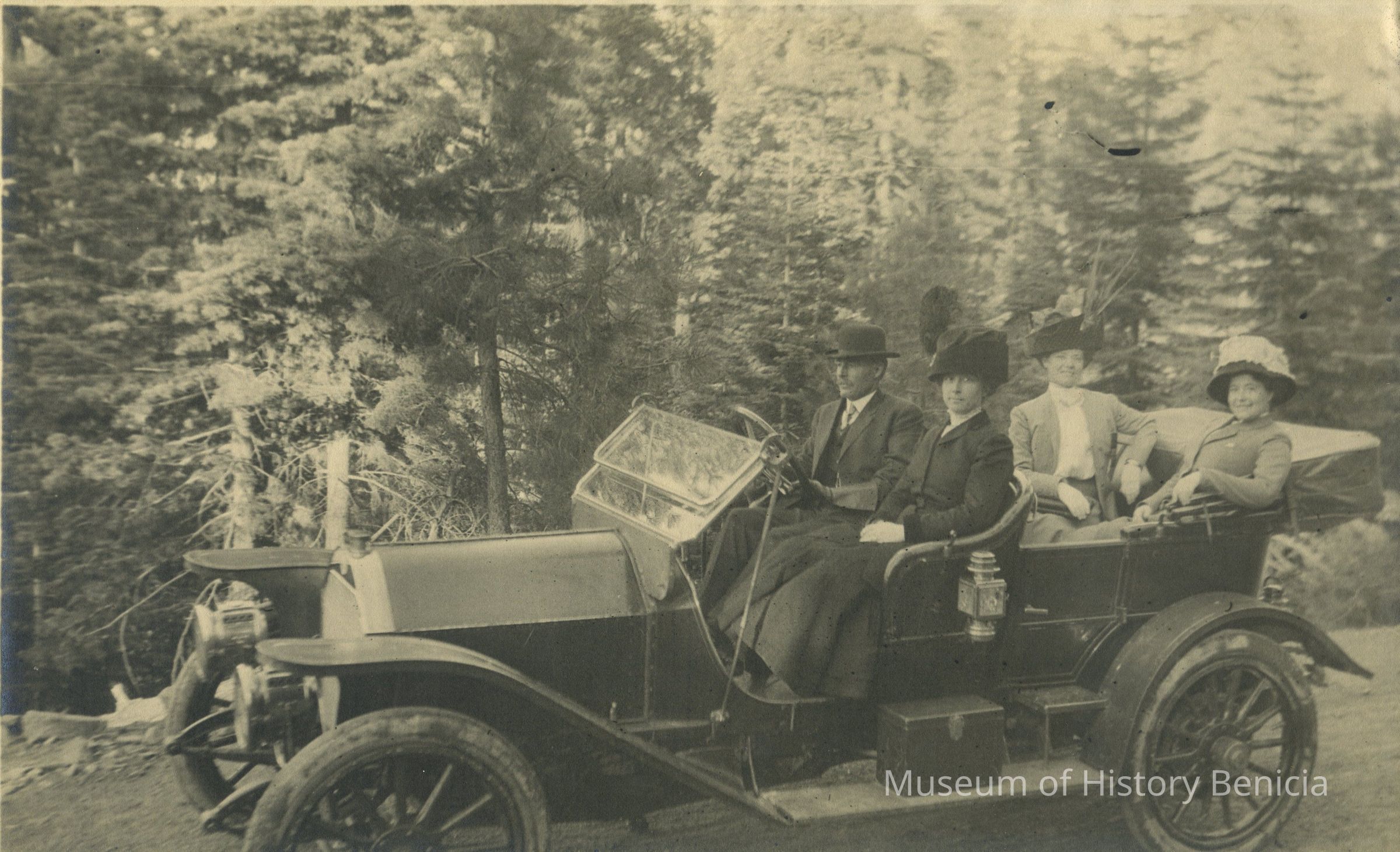 B/W photograh of four people in a touring car in a forested area.