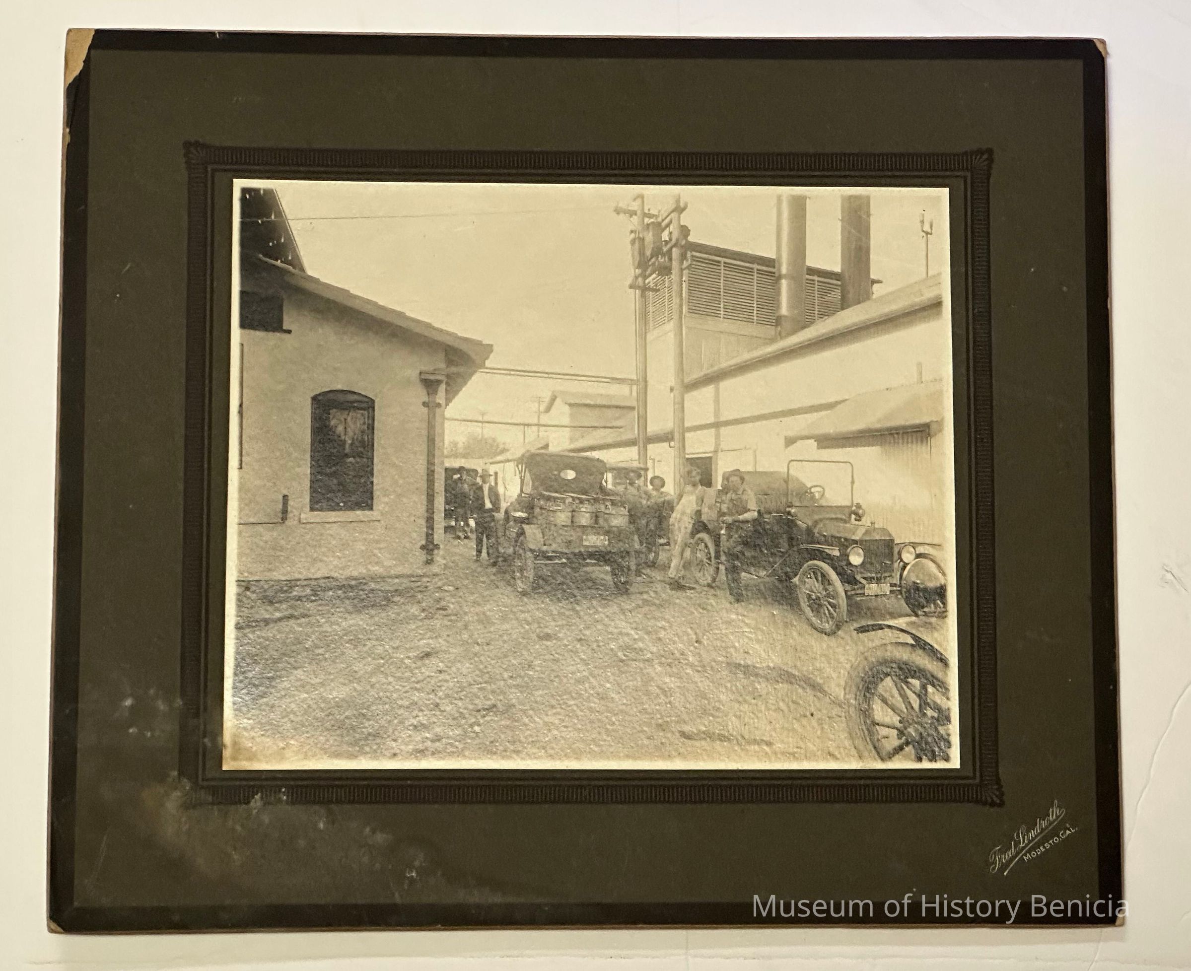 9 1/2" x 7 3/4" photo pasted in 12" x 14" cardboard frame. Framed by "Fred Lindroth, Modesto Cal". Blank back.Collection
