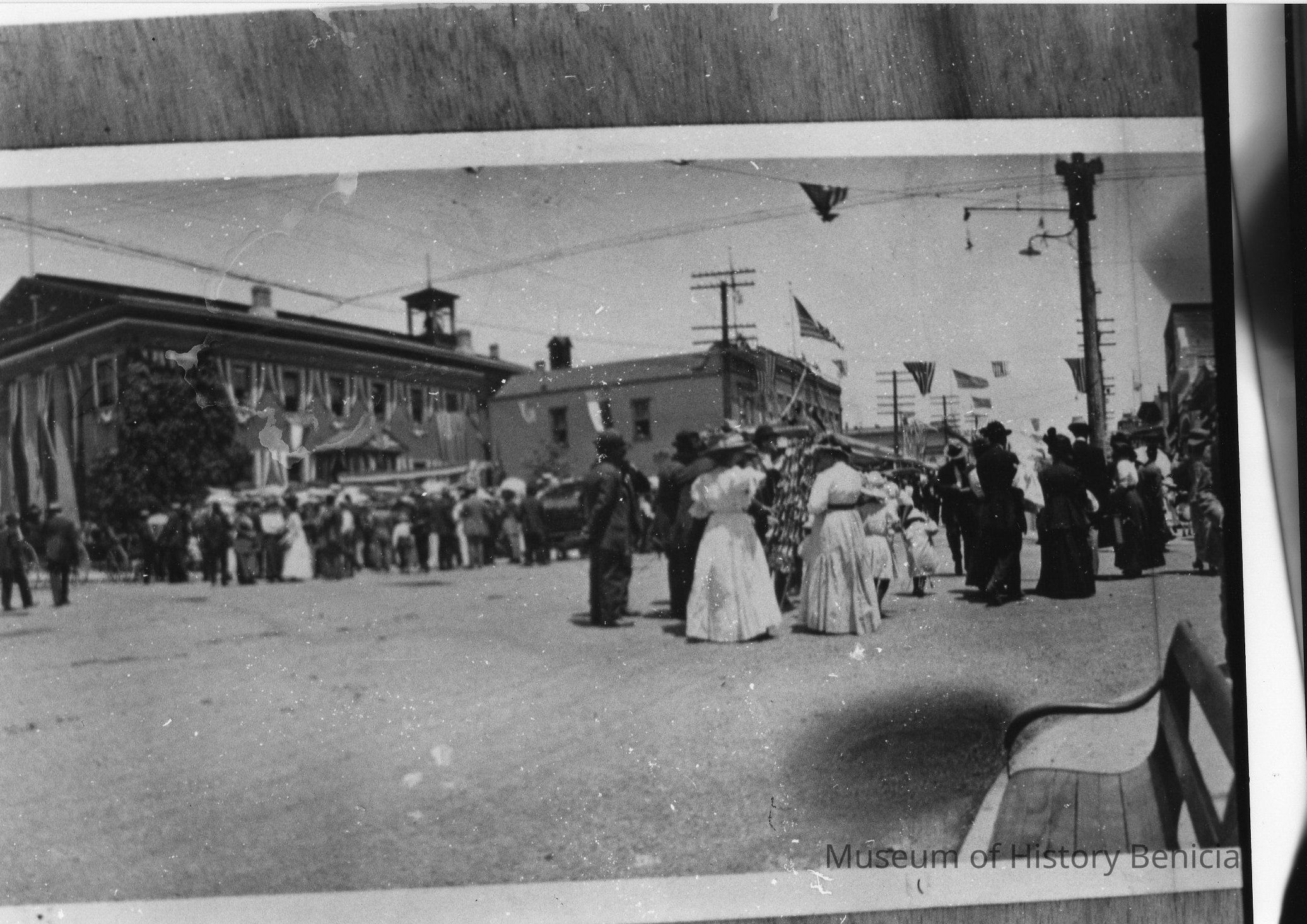 B/W Photograph: Benicia, First and G Streets, possibly on July 4. Capitol building in background.