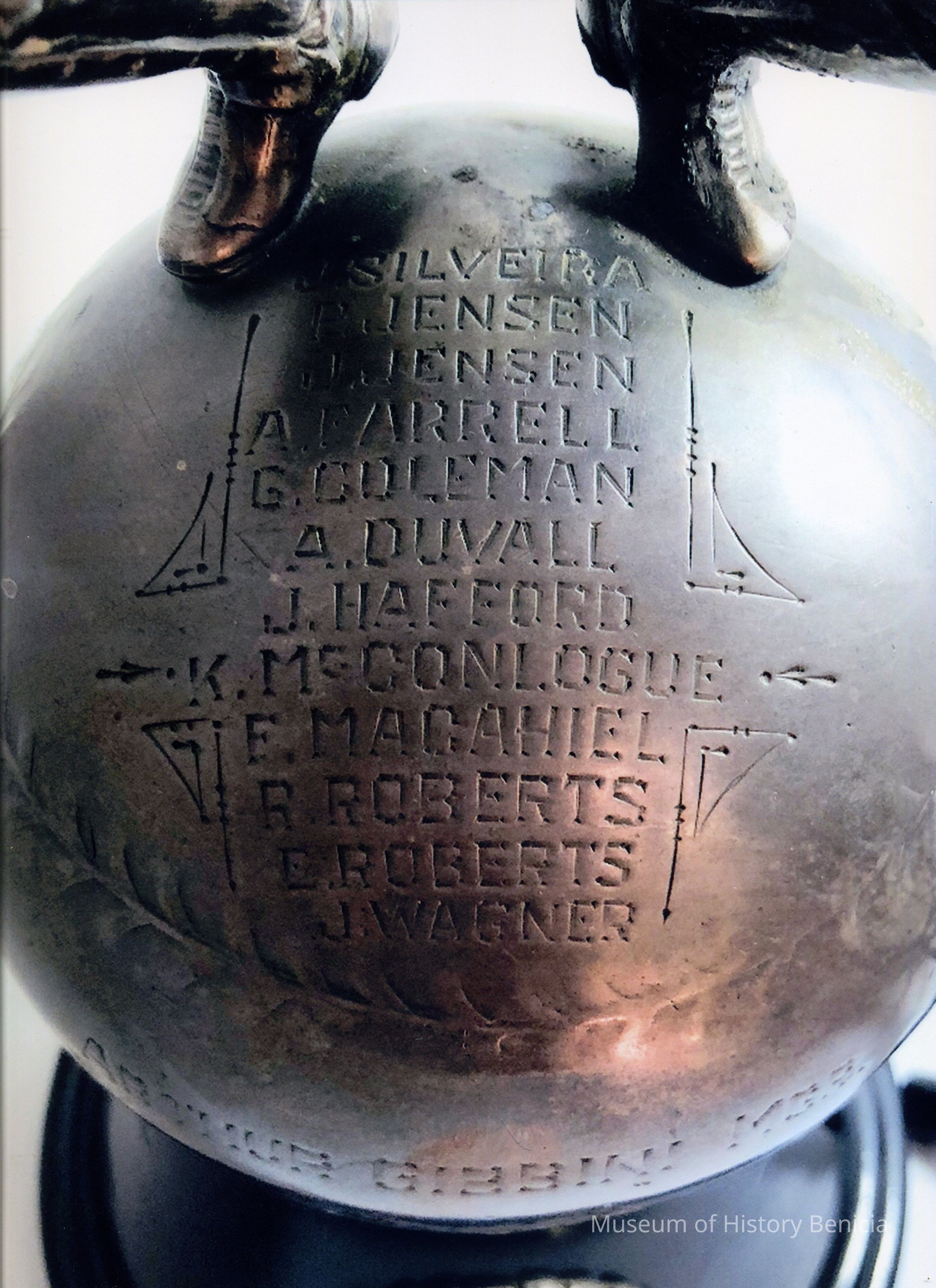 On the baseball are the names of the men on the team: J. Silveira, P. Jensen, J. Jensen, A. Farrell, G. Coleman, A Duvall, J. Hafford, K. McConlogue, F. Macahiel, R. Roberts, E. Roberts, J. Wagner; the manager's name, Arthur Gibbini, is across the front of the ball in large letters.