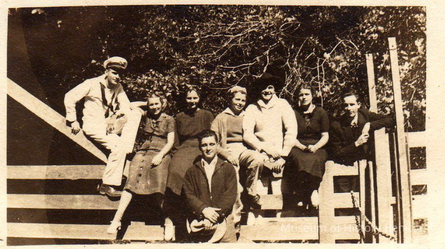 B/W photograph shows a group of young people posing on and next to a fence; there are four men (one in a naval uniform) and four women in the photograph; location is unknownCollection