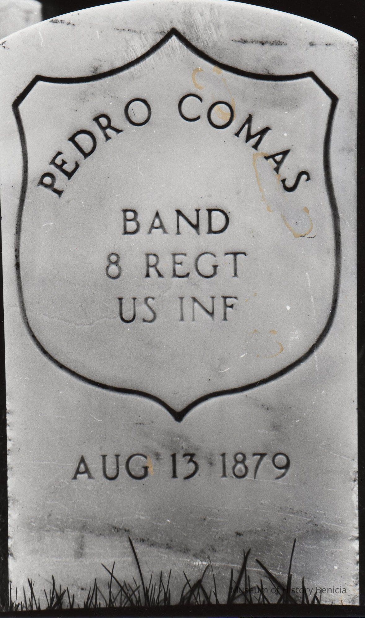 B/W Photograph: Tombstone of Pedro Comas, Band 8 Regt. U.S. INF. Died August 13, 1879. He is buried in the Benicia Military Cemetery.