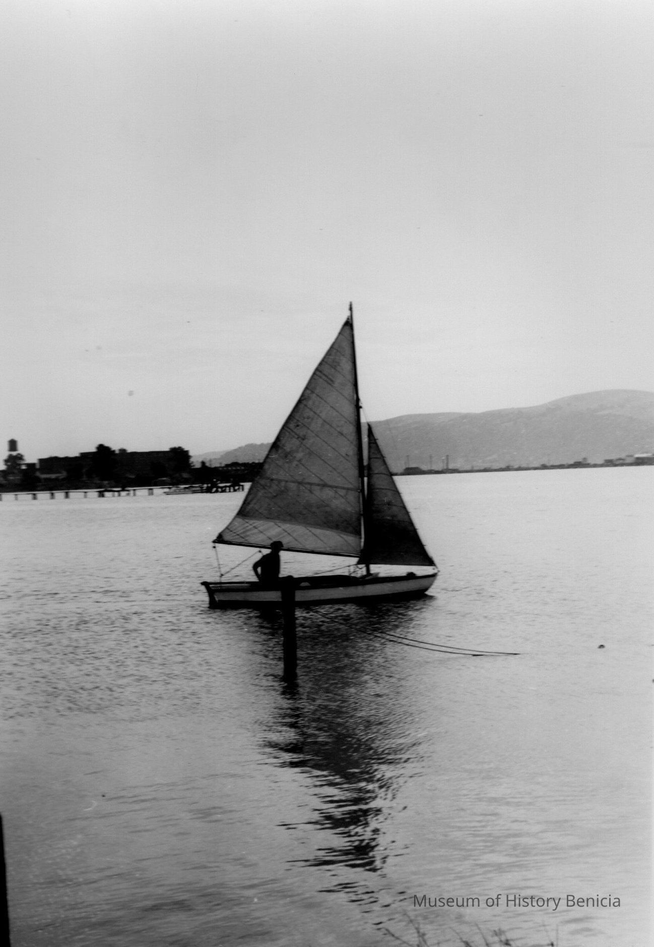 B/W photo of a person in a sailboat on the Carquinez Straits as seen from the Benicia waterfront, looking eastward toward the West Second Street area.Collection