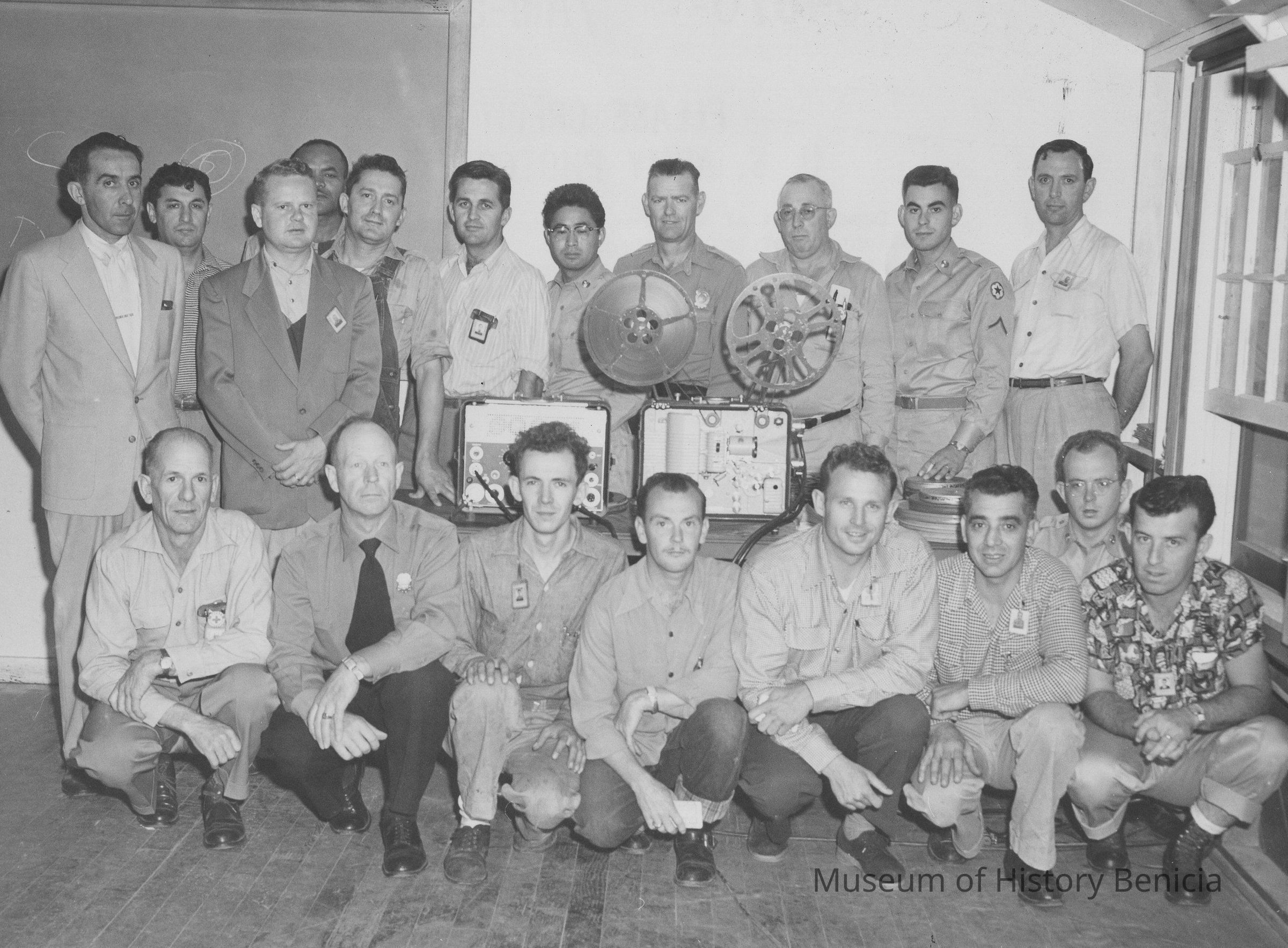 B/W Photograph: Group of men around film projector. On back: "Projectionists" in pencil. Top right: "Jack Kirgin", "Al Meeley"; bottom right: "Floyd Arnett" (in ink), "04070-305-