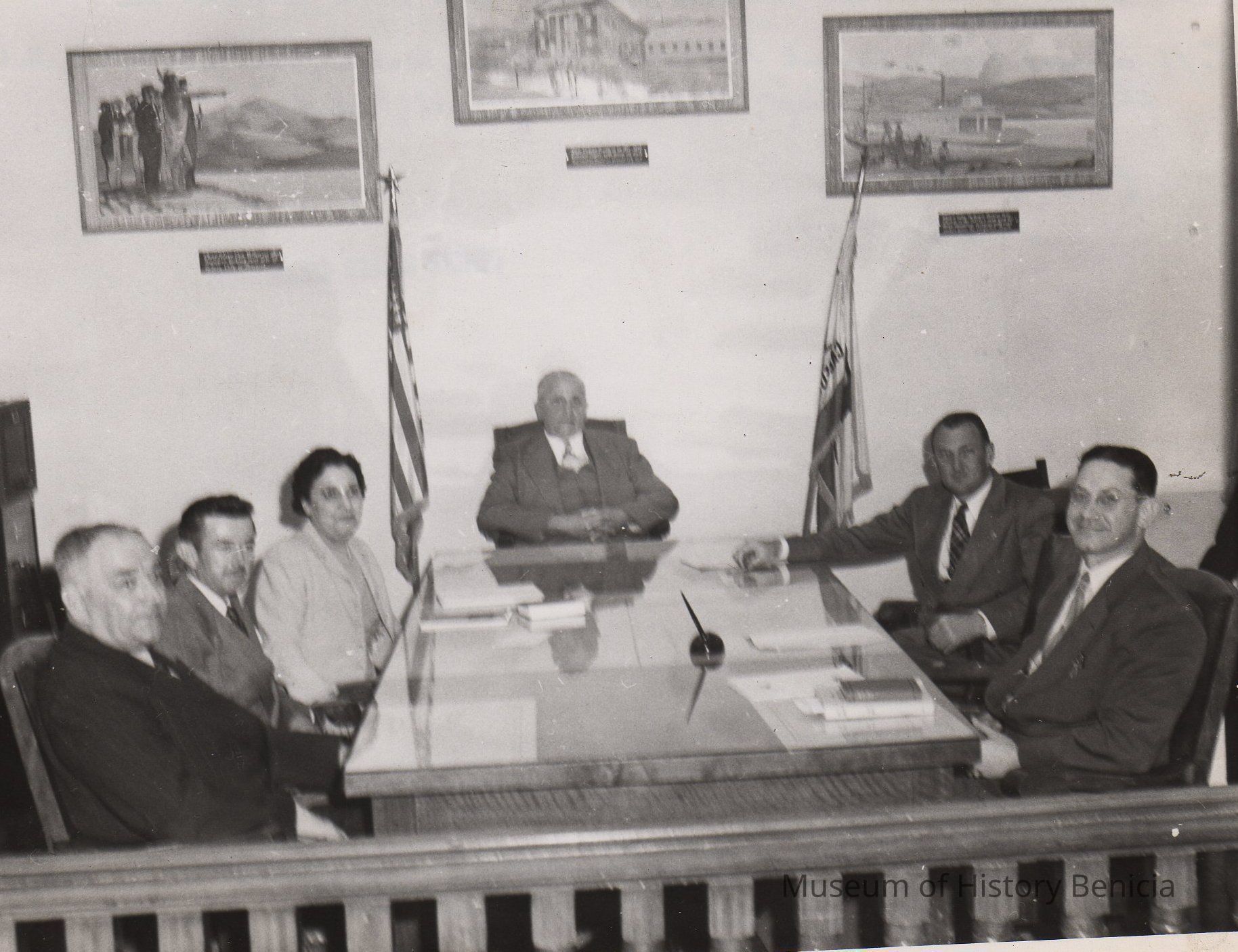 B/W photograph: Benicia City Council in council chambers in old State Capitol. L/R: Ernest Gallardo, Michael Walsh, Anna Pine, city clerk, Thomas Wright, mayor, Michael Fitzgerald and Sol Rose.Collection