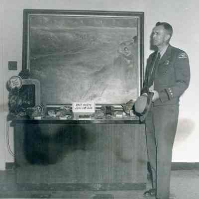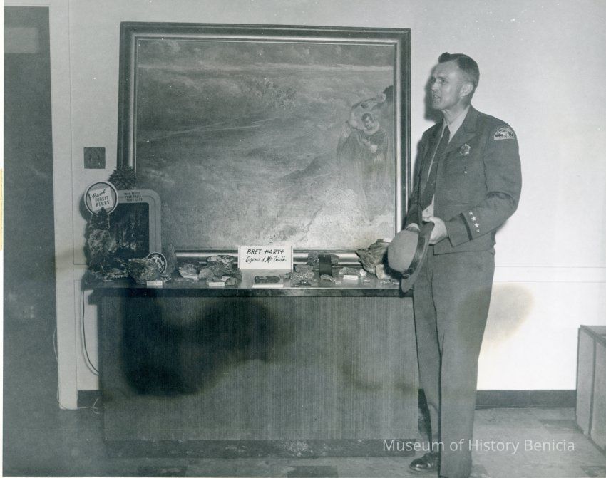 This is a photo of a display regarding Mt Diablo. There is a California State Park ranger standing next to a table containing rocks and with a painting behind of a priest looking over a valley. The photo is part of a group of photos of the Benicia State Capitol taken by Dr. William Dublin.Collection