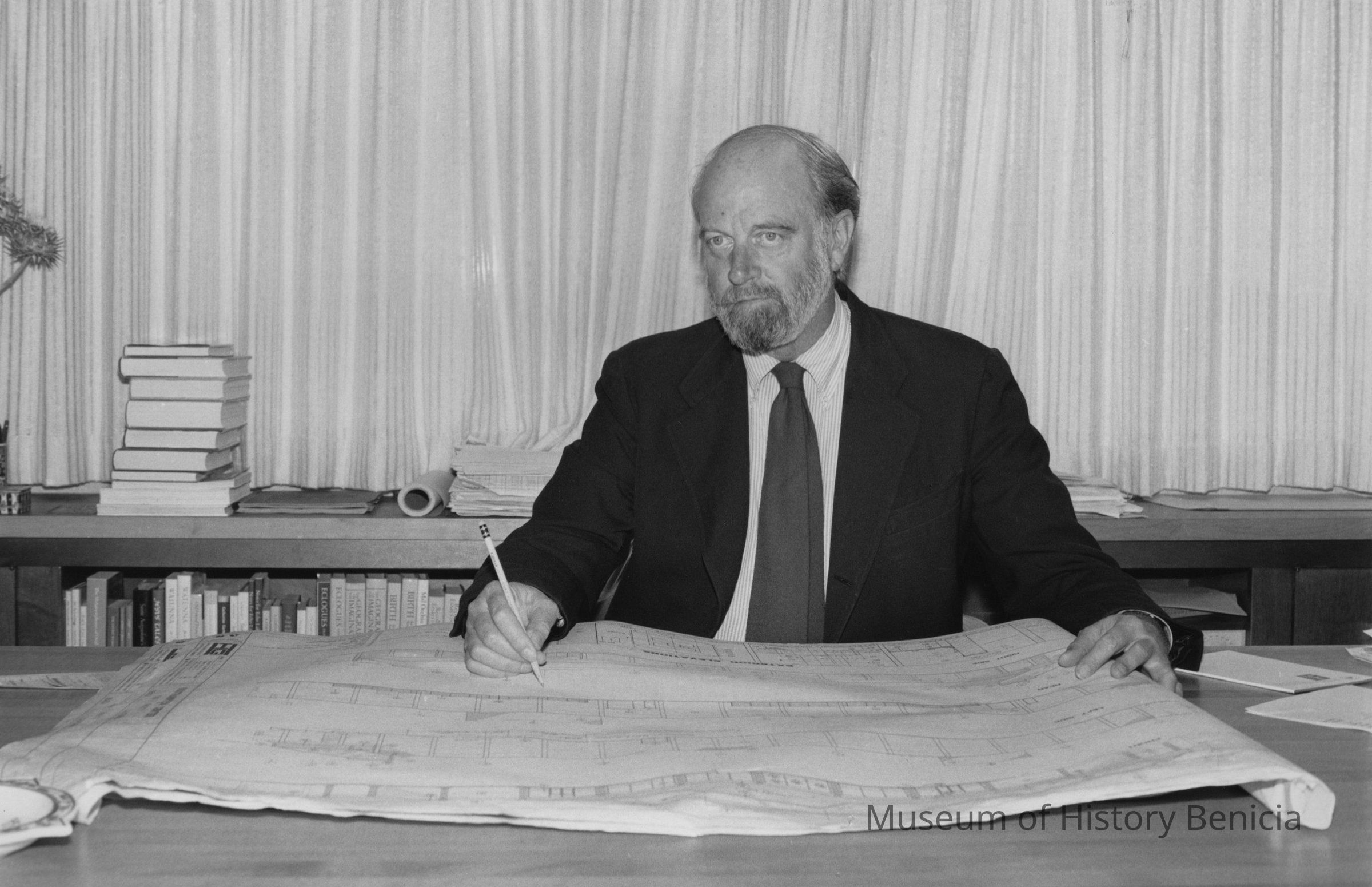 B/W photograph of William Turnbull sitting at a desk w/blue prints and pencil in hand.