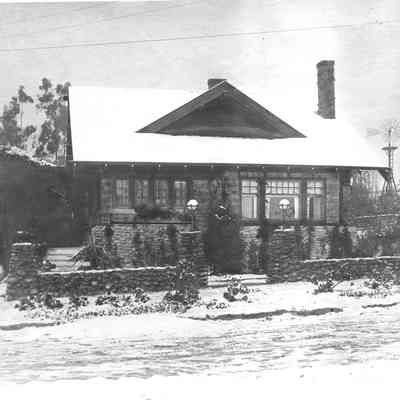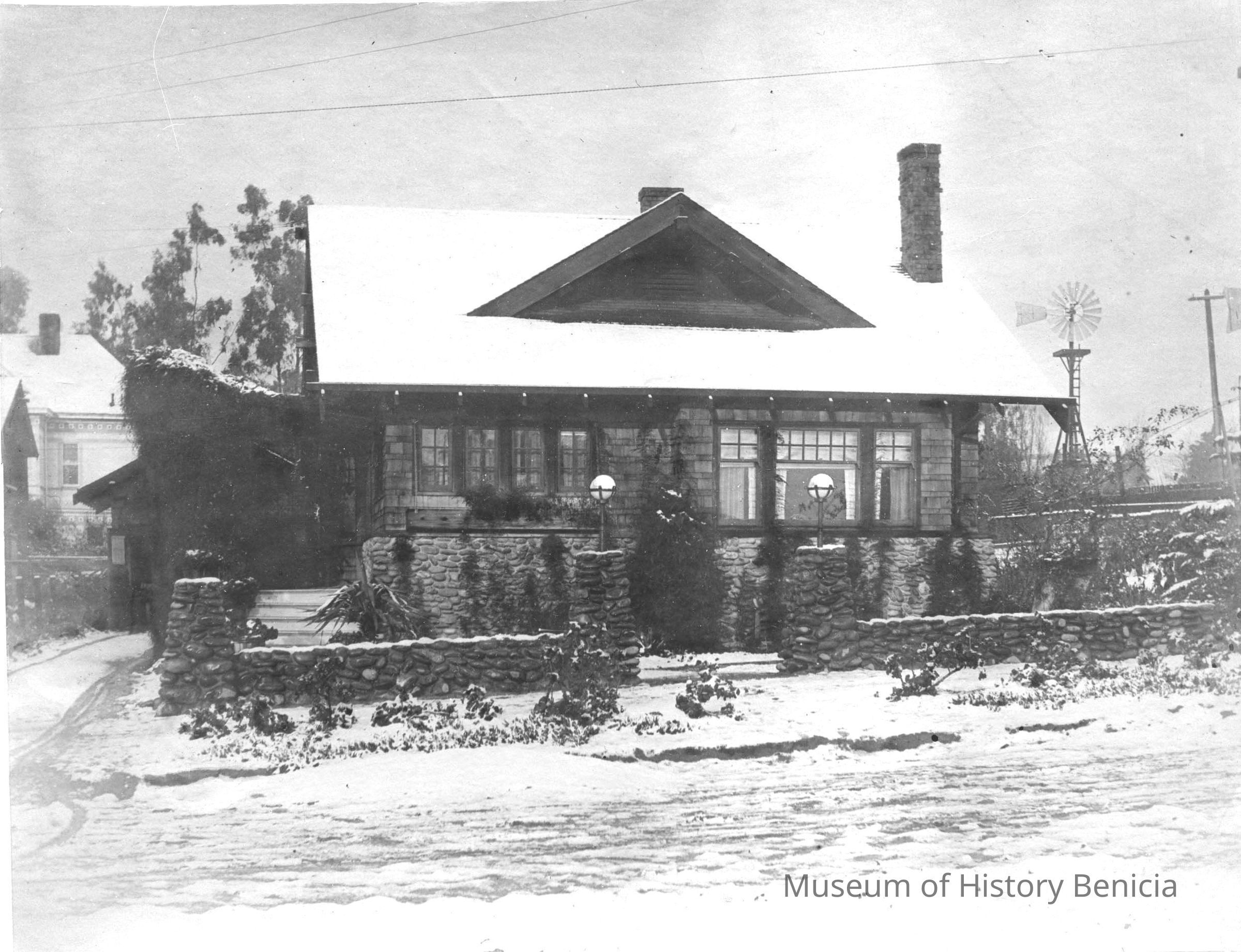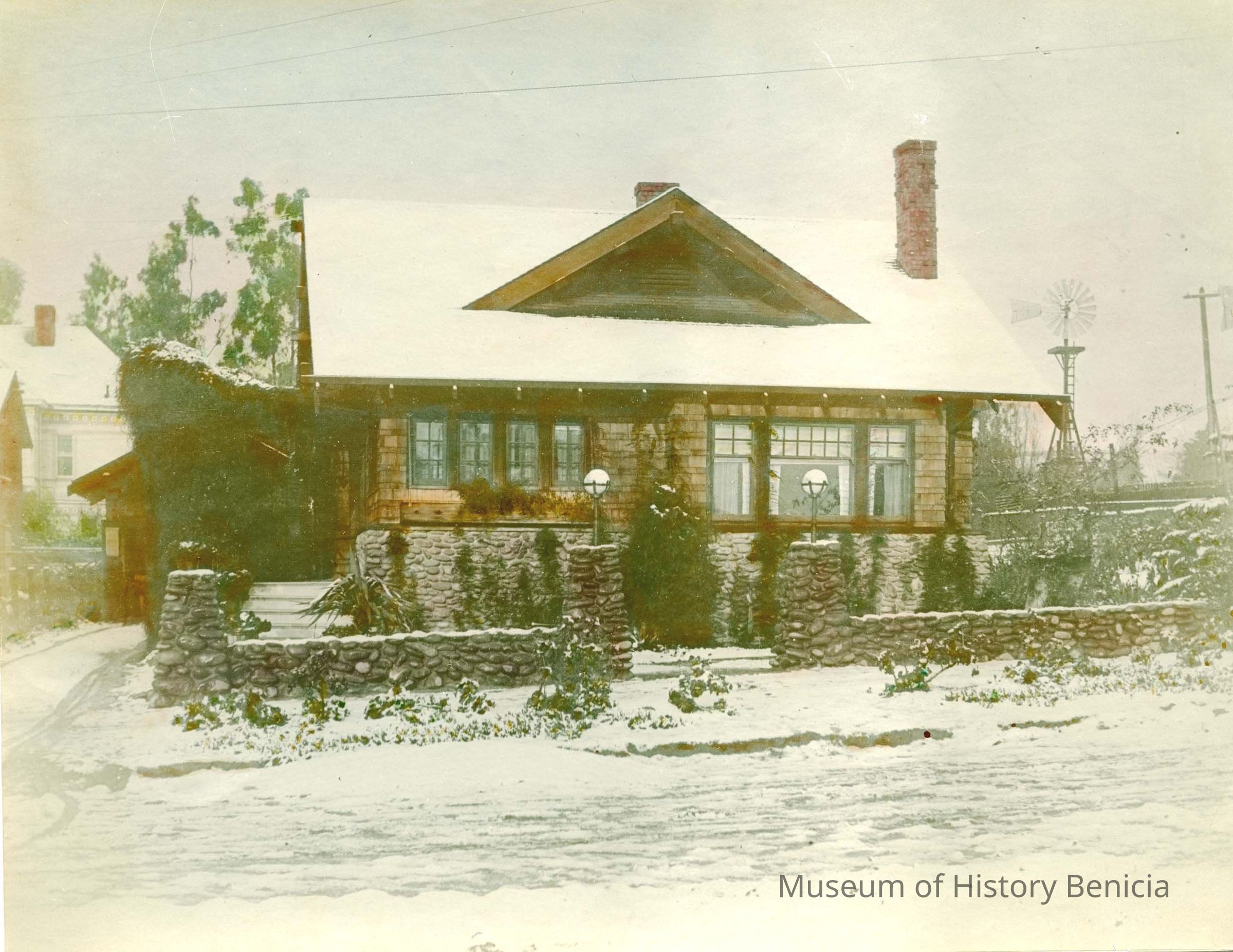Photo of the house on West 2nd street in Benicia. It was originally built by Dr. White. There is snow on the ground. This could be a print of a John Molfino photo of the same house taken in snow.