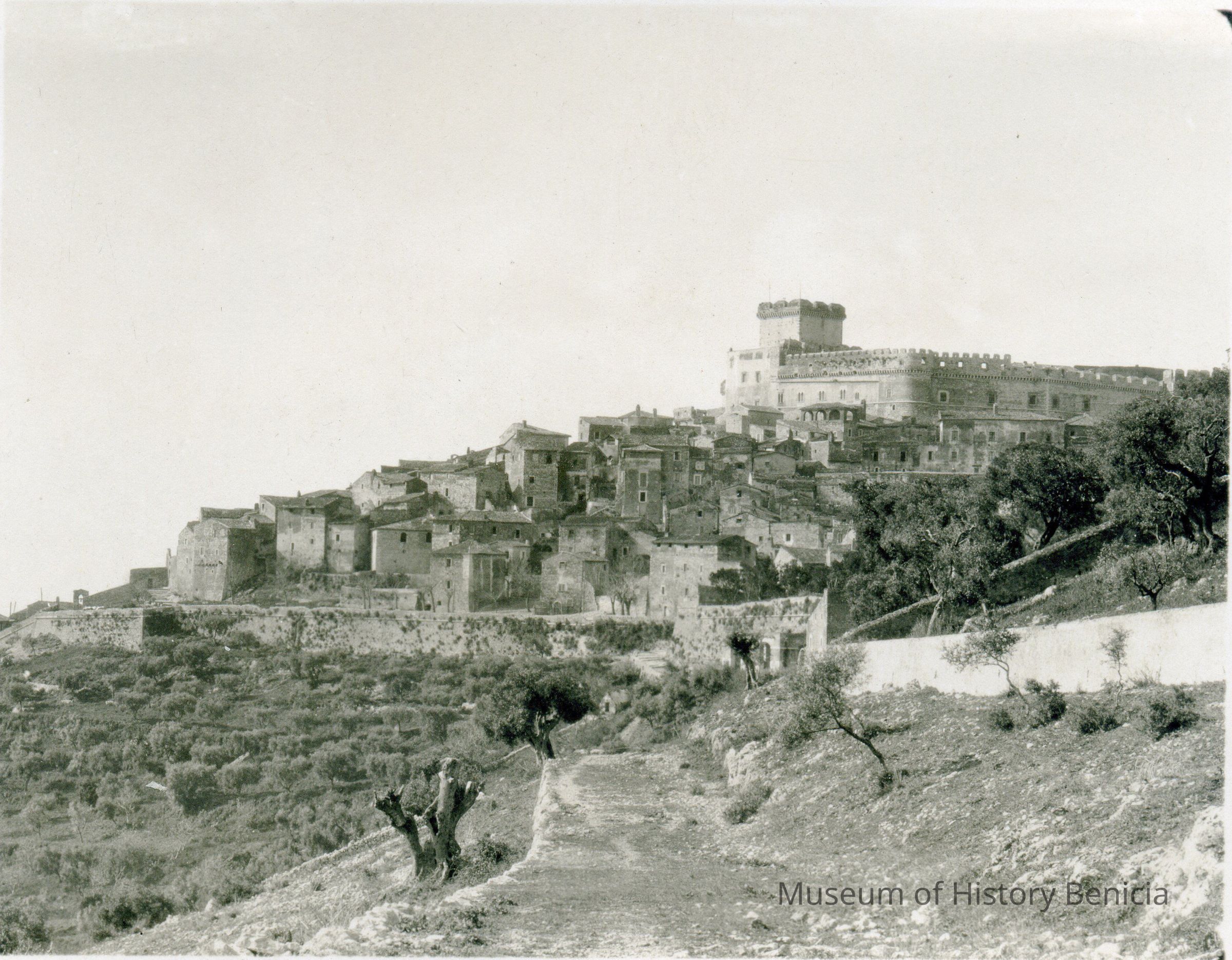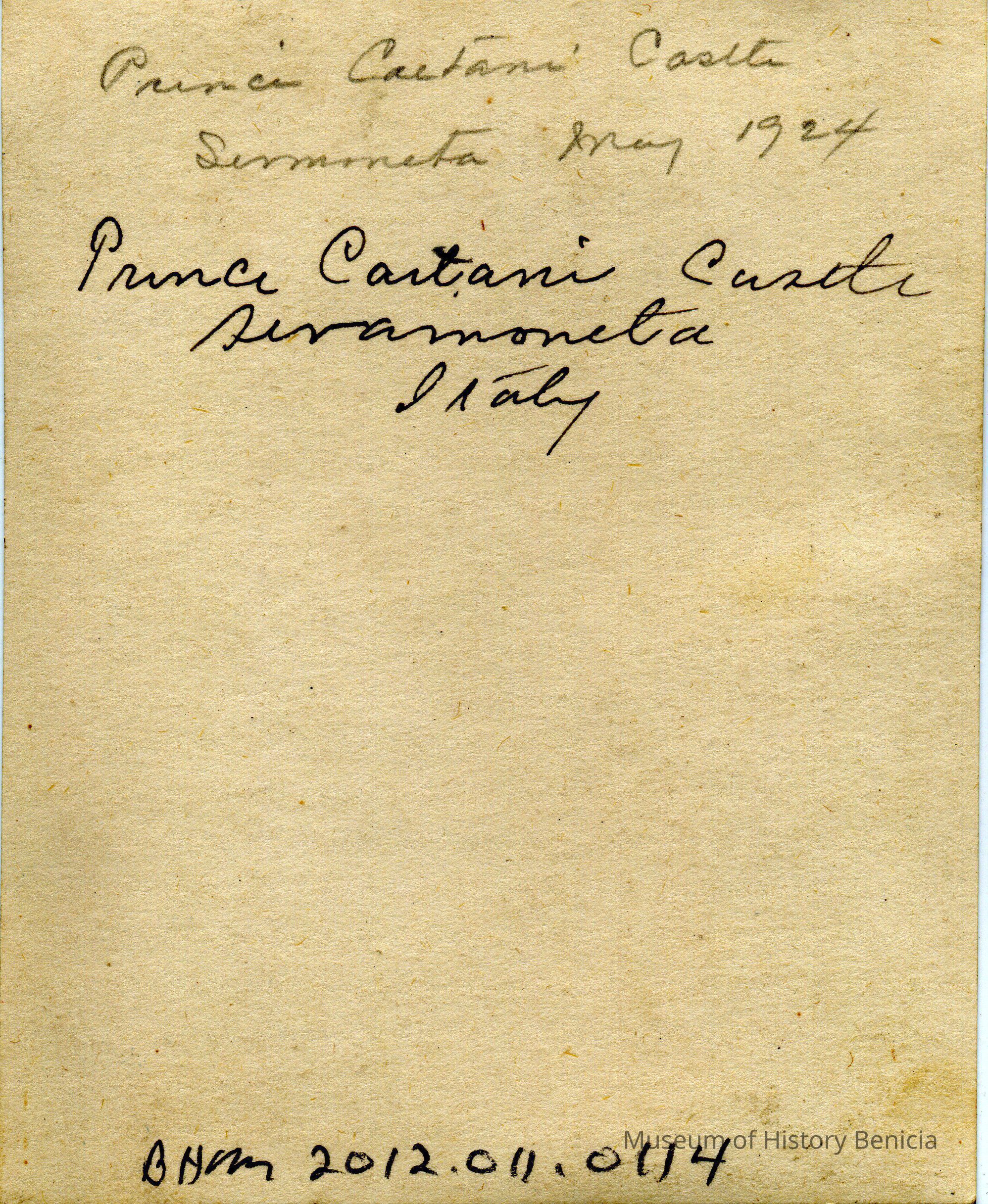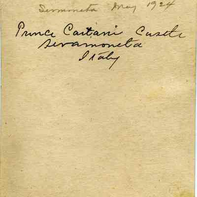 A photo of a castle on a hill. On the back is written " Prince Cartani Castle Siramoneta Italy 1924. I is then repeated in a different hand.Collection