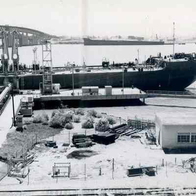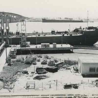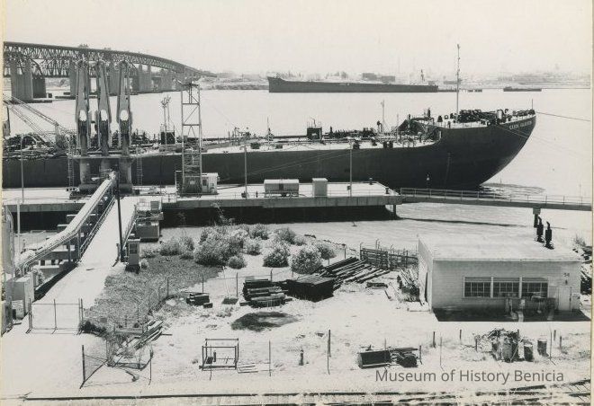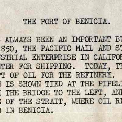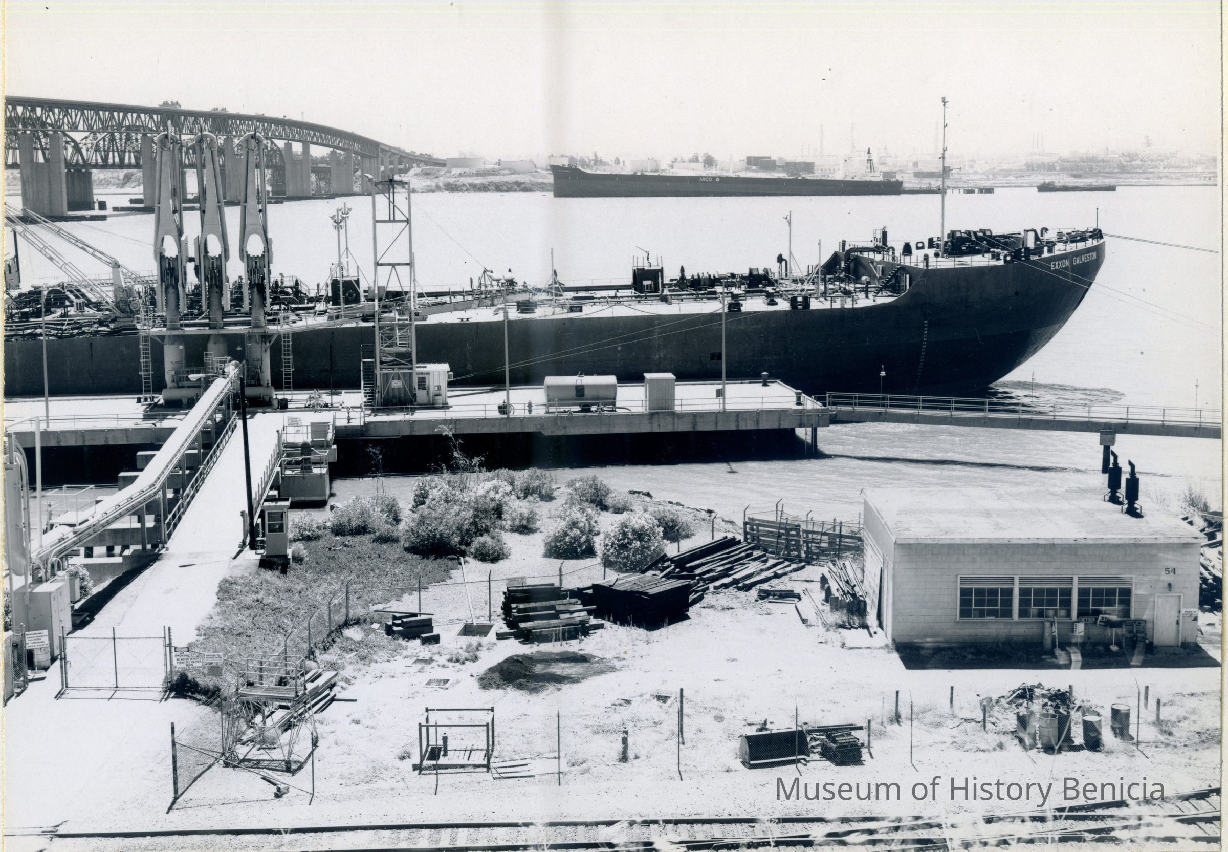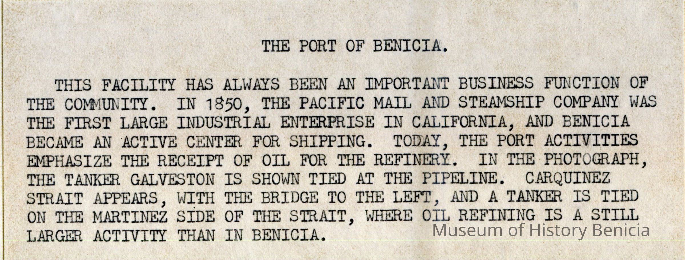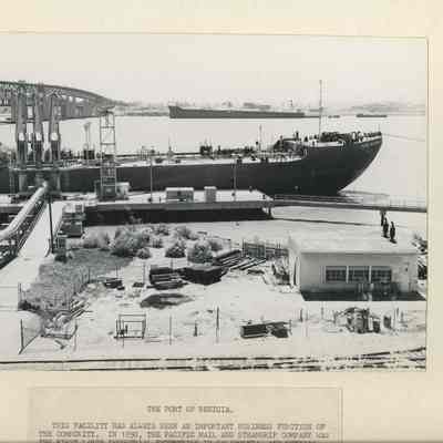 B/W Photograph originally framed under glass in a black frame with gold trim. The photograph is glued on a mat board. The caption reads: "The Port of Benicia. This facility has always been an important business function of the community. In 1850 the Pacific Mail Steamship Company was the first large industrial enterprise in California, and Benicia became an active center for shipping. Today, the port activities emphasize the receipt of oil for the refinery. In the photograph, the tanker "Galveston" is shown tied at the pipeline. Carquinez Strait appears, with the bridge to the left, and a taker is tied on the Martinez side of the strait, where oil refining is a still larger activity than in Benicia."Collection