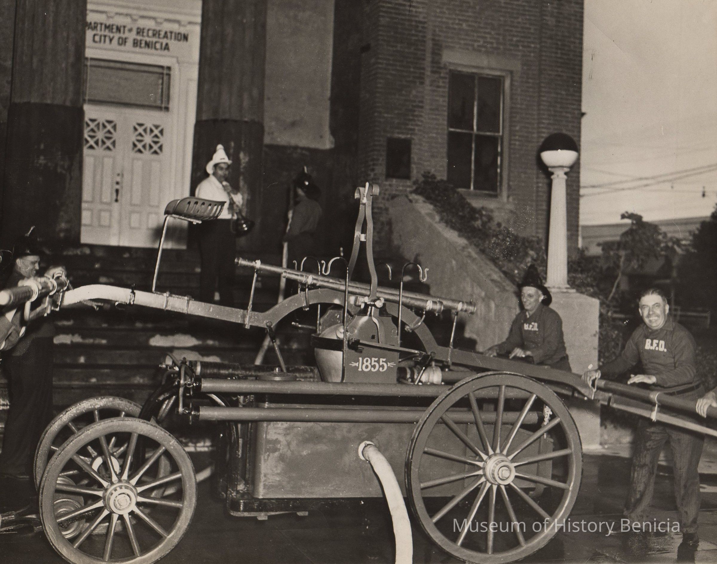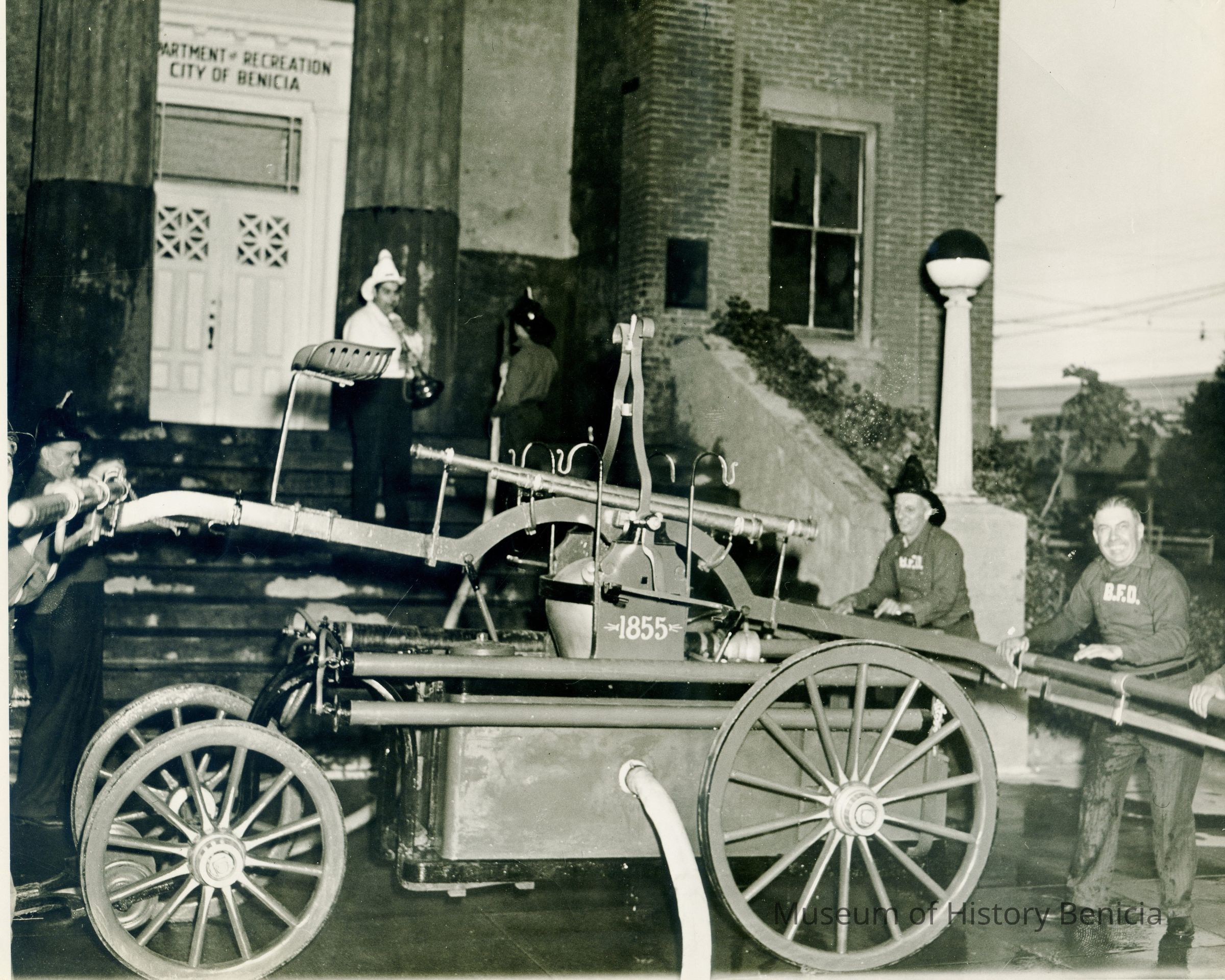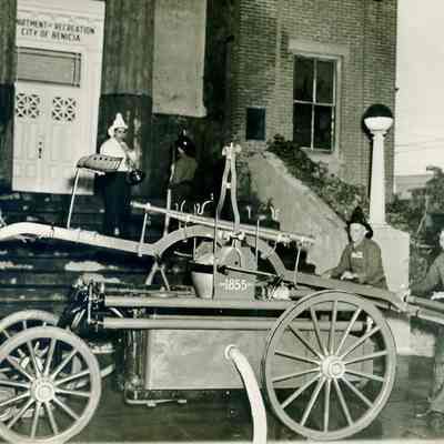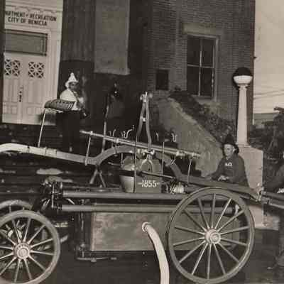 Washing the steps--re-enactment--tradition for Admission Day celebration. Captain in white--Jerry Dana. Solano Engine #1-- 1855 (named after Chief Solano). B/W photo.Collection
