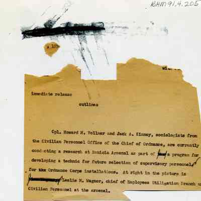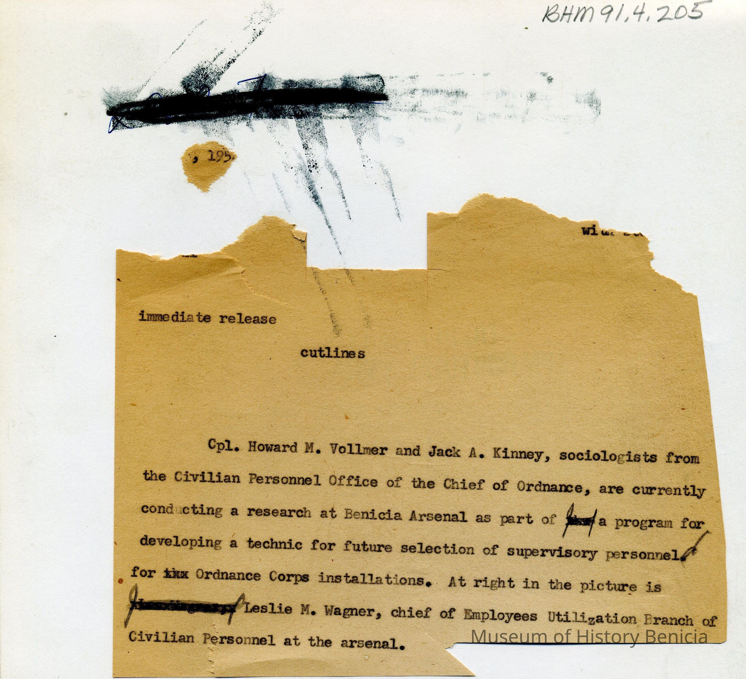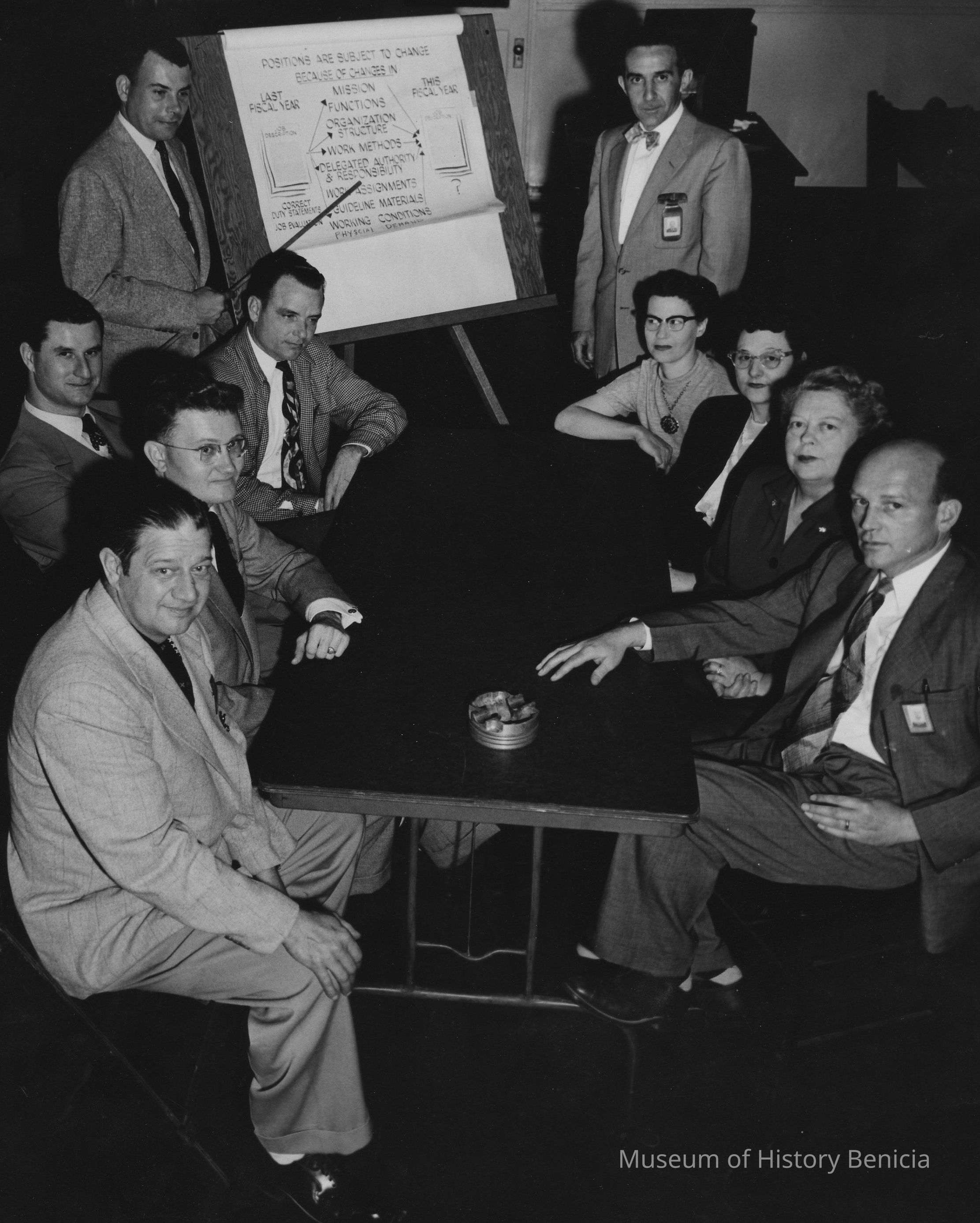 B/W Photograph: Cpl. Howard M. Vollmer and Jack A. Kinney, sociologists, with Benicia Arsenal employees. At right is Leslie Wagner.