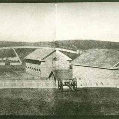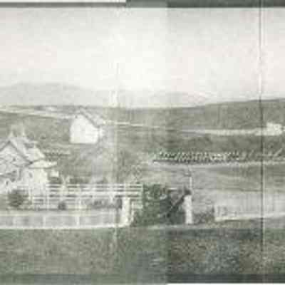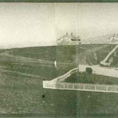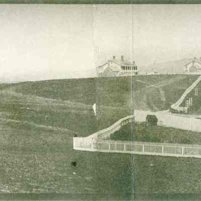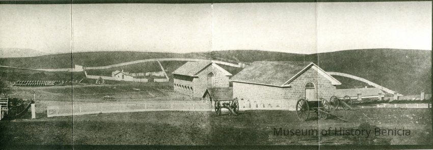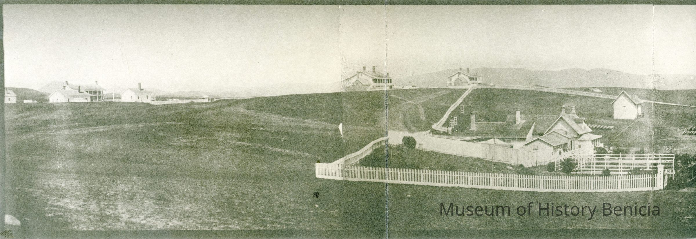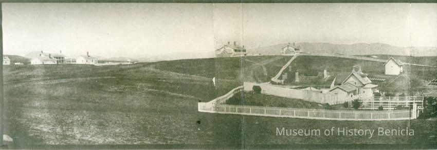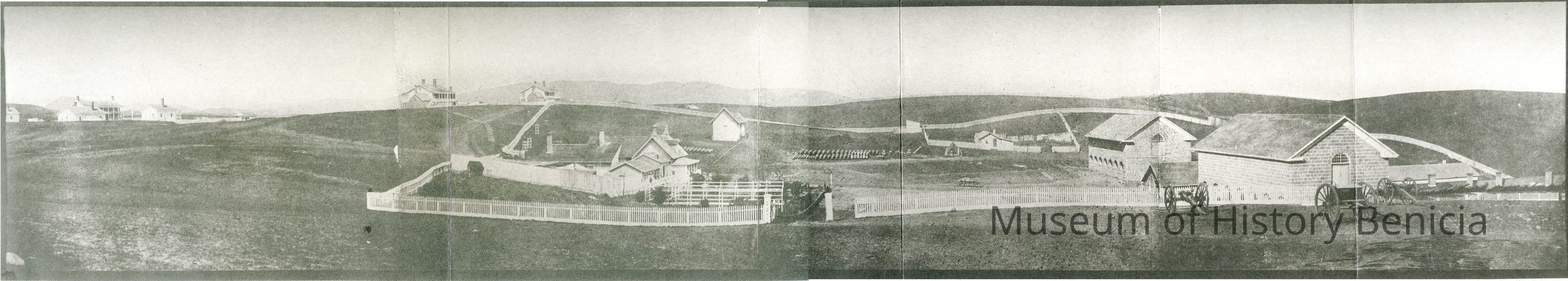 This is a panorama photograph of the Benicia Arsenal. It shows the Museum buildings in the foreground. The Benicia Barracks are in the background and a house with white picket fences around it also in the foreground. This is a copy of an old panorama photograph made of 4 photographs glued together.